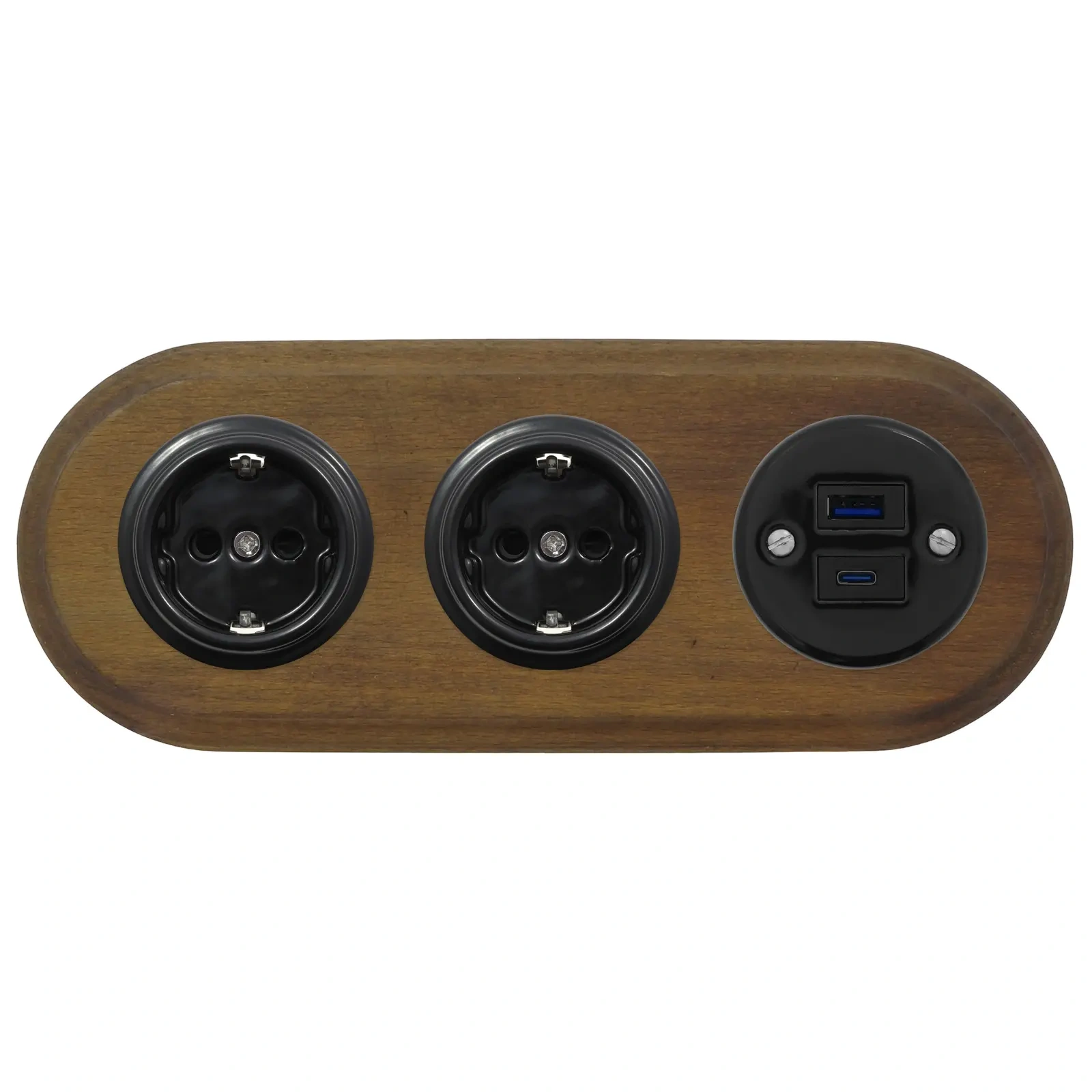 2x Gniazdo Schuko okrągłe + Gniazdo USB A+C 4A czarne z ramką potrójną ciemne drewno, montaż podtynkowy, Ceramic Loft