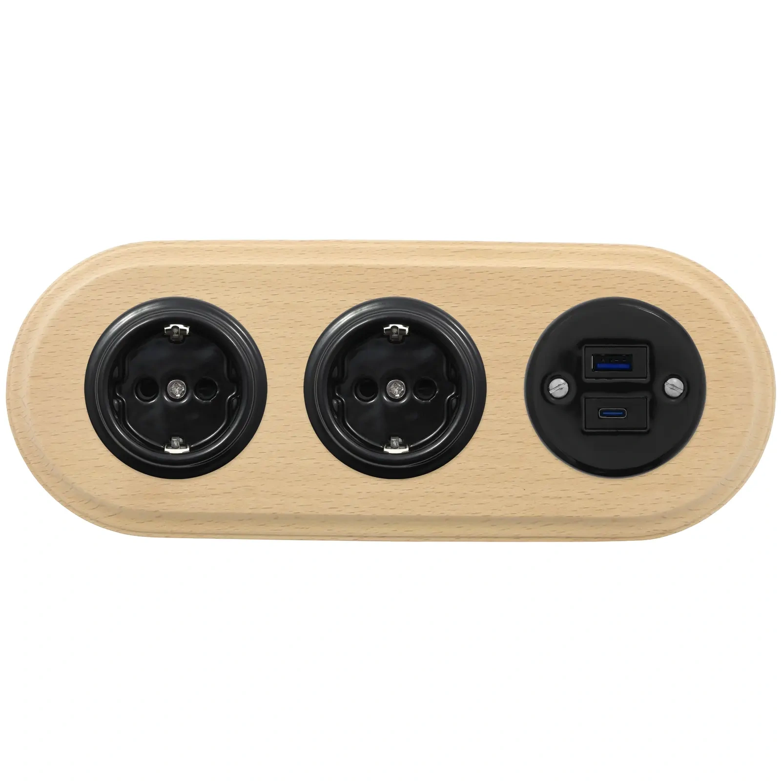 2x Gniazdo Schuko okrągłe + Gniazdo USB A+C 4A czarne z ramką potrójną jasne drewno, montaż podtynkowy, Ceramic Loft
