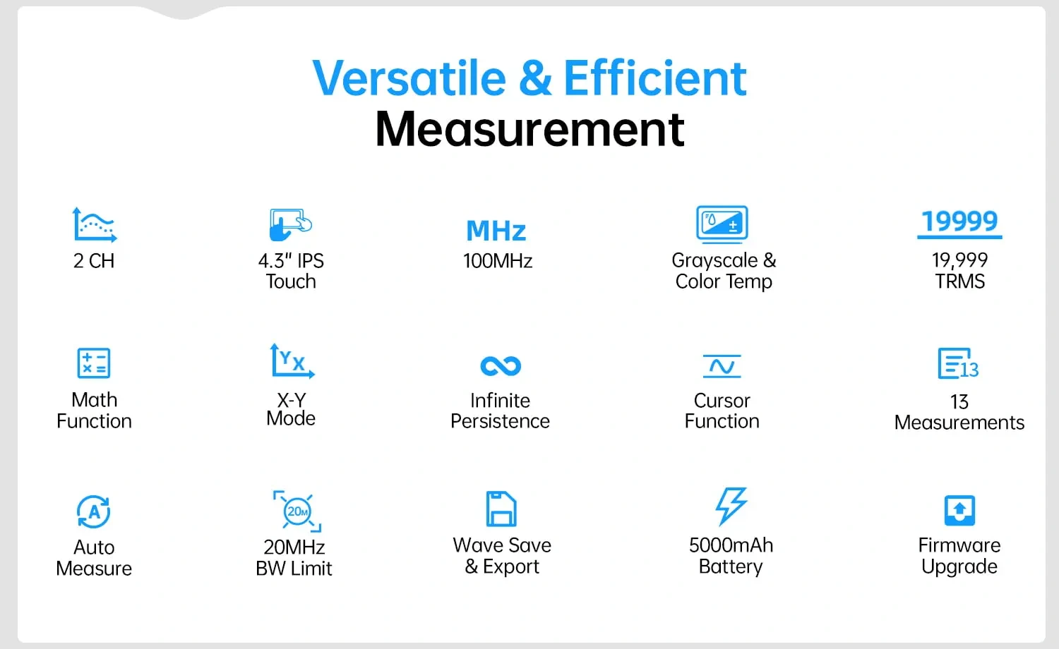Oscyloskop oferuje próbkowanie 500 MSa/s, pasmo 100 MHz (1CH) / 50 MHz (2CH) oraz regulowaną głębokość pamięci do 1 M punktów, co umożliwia dokładną analizę zarówno wolnych, jak i szybkich przebiegów. Zastosowany wyświetlacz IPS 4,3" z obsługą dotykową w połączeniu z fizycznymi przyciskami i enkoderami zapewnia szybki dostęp do funkcji bez zbędnego klikania w menu.
