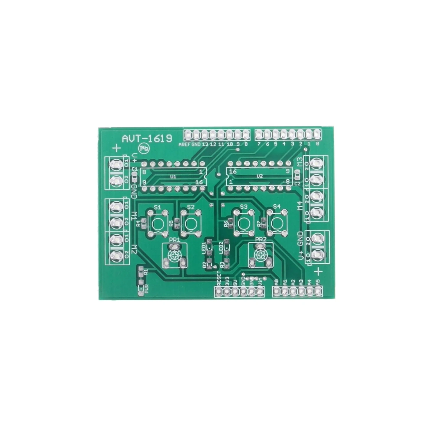 Kolejny ‘klocek’ z serii AVTduino, tym razem odpowiedzialny za sterowanie silnikami elektrycznymi. Układ opracowano wykorzystując dwa układy L293. Każdy z nich zawiera w swej strukturze po dwa mostki H. W efekcie moduł może sterować maksymalnie czterema dwukierunkowymi silnikami prądu stałego lub dwoma silnikami krokowymi. Urządzenie szczególnie polecane użytkownikom systemu AVTduino, robotykom, modelarzom