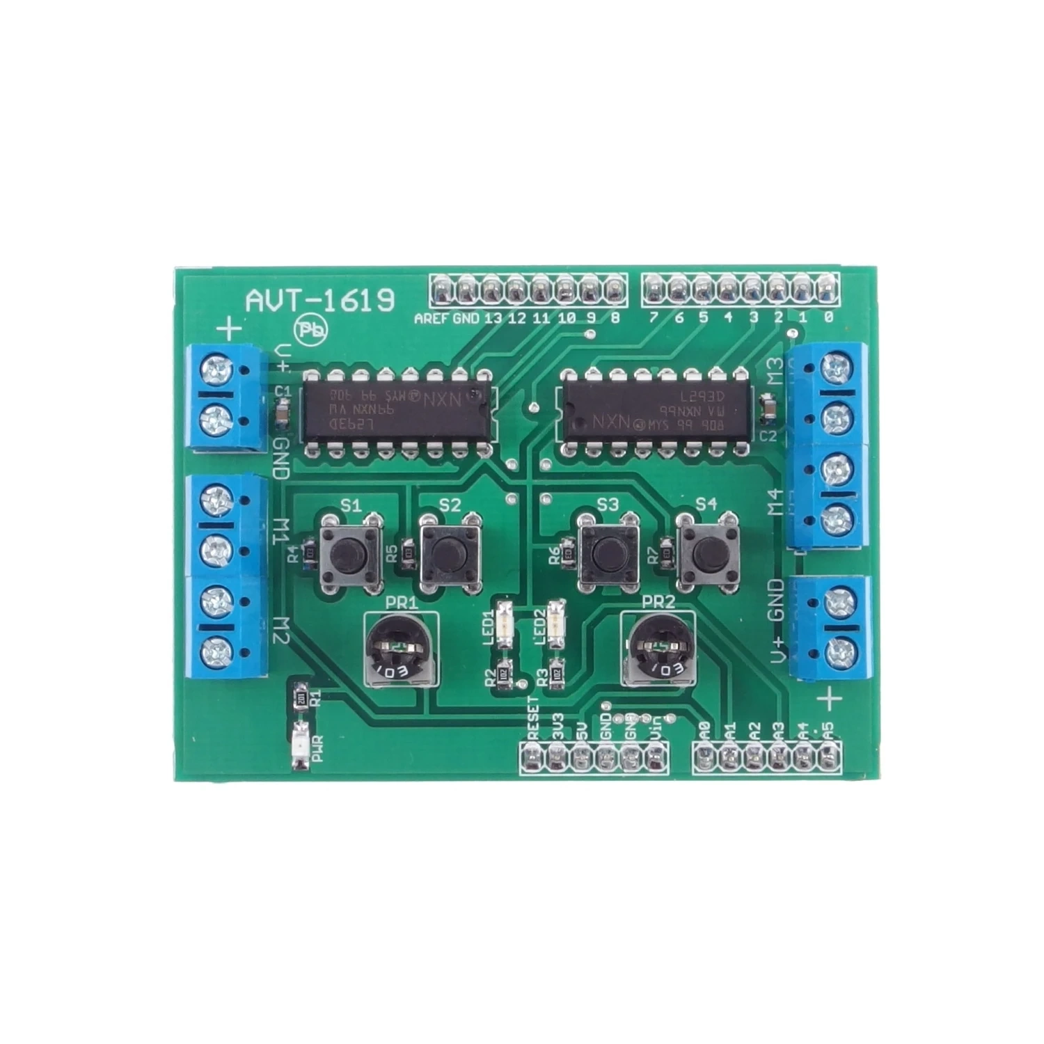 Kolejny ‘klocek’ z serii AVTduino, tym razem odpowiedzialny za sterowanie silnikami elektrycznymi. Układ opracowano wykorzystując dwa układy L293. Każdy z nich zawiera w swej strukturze po dwa mostki H. W efekcie moduł może sterować maksymalnie czterema dwukierunkowymi silnikami prądu stałego lub dwoma silnikami krokowymi. Urządzenie szczególnie polecane użytkownikom systemu AVTduino, robotykom, modelarzom