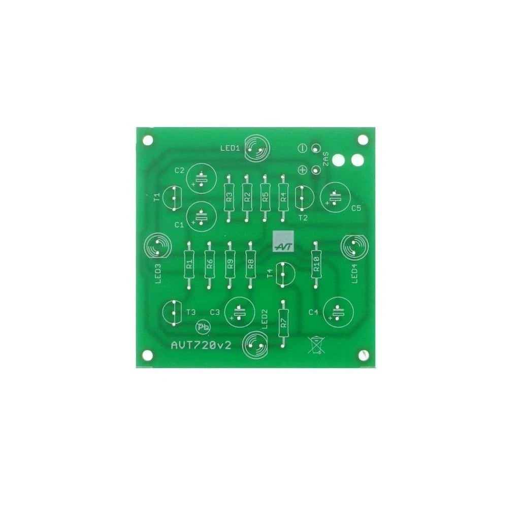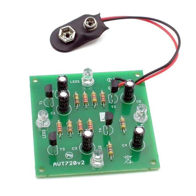 Układ wytwarzający interesujący efekt świetlny. Dwie pary diod LED migają w zmiennym rytmie. Zastosowanie ultra jasnych diod święcących zapewnia widzialność układu z dużej odległości - w ciemności nawet do kilkuset metrów. Kit można zasilać z baterii - dzięki temu mamy błyskotkę mobilną:-)