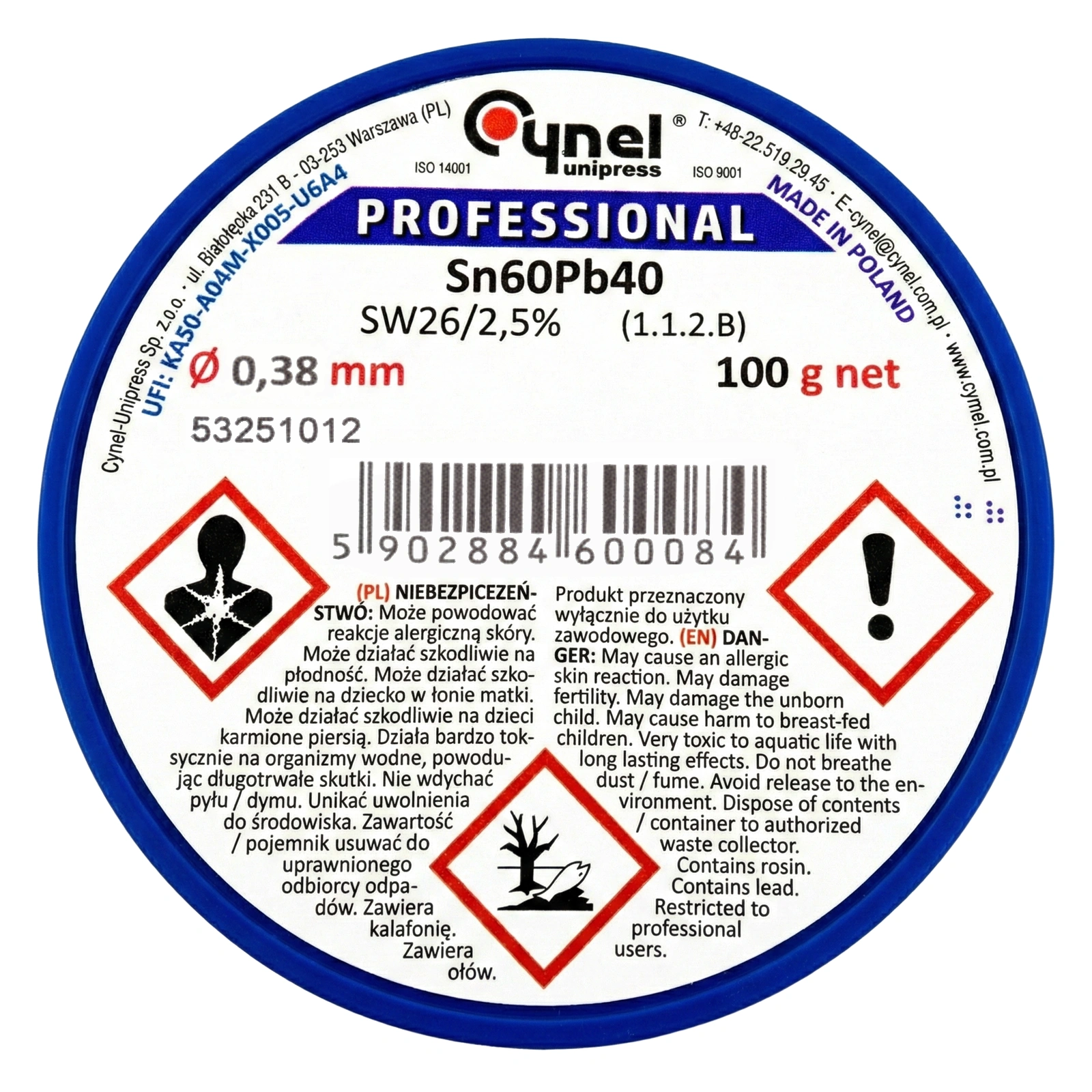 Spoiwo Sn60Pb40 z topnikiem SW26 zostało wyprodukowane w pierwszym wytopie cyny i ołowiu zgodnie z EN ISO 9453:2014. Zawiera kalafoniowy, halogenkowy topnik SW26. Produkt przeznaczony do profesjonalnego lutowania automatycznego i ręcznego w elektronice i elektrotechnice, gdzie nie jest wymagane spełnienie warunków dyrektywy RoHS2.
