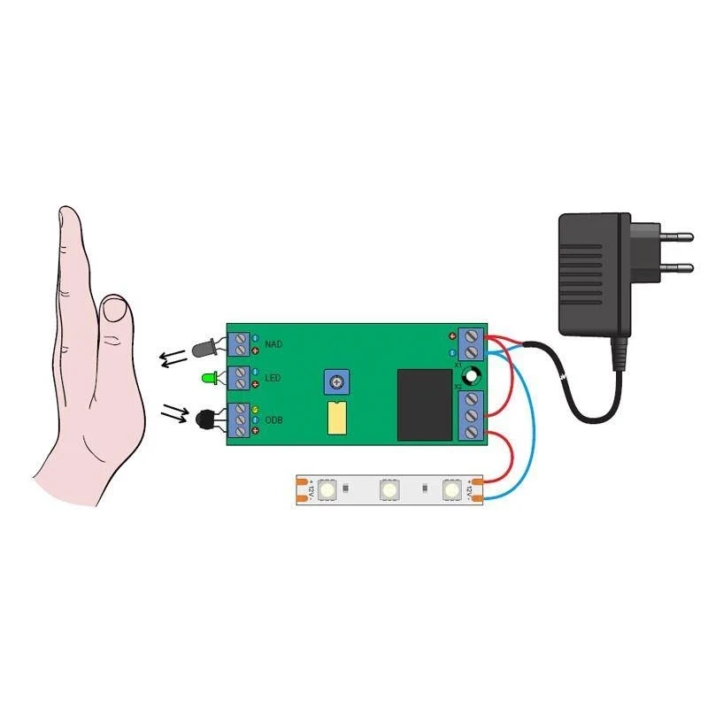Moduł czasowego włącznika zbliżeniowego można potraktować jako element automatyki domowej, którego działanie opiera się na zasadzie wysyłania wiązki promieni podczerwieni przez nadajnik i ich odbieraniu przez odbiornik. Wiązka promieni świetlnych emitowanych przez nadajnik, napotykając na swojej drodze przeszkodę, odbija się od niej zgodnie z prawami fizyki. Część tych promieni podczerwieni trafia bezpośrednio do odbiornika, gdzie wzmocnione służą do wytworzenia sygnału przełączającego wyjście czujnika.