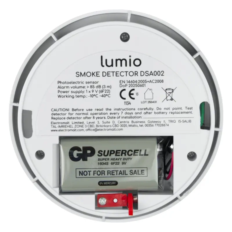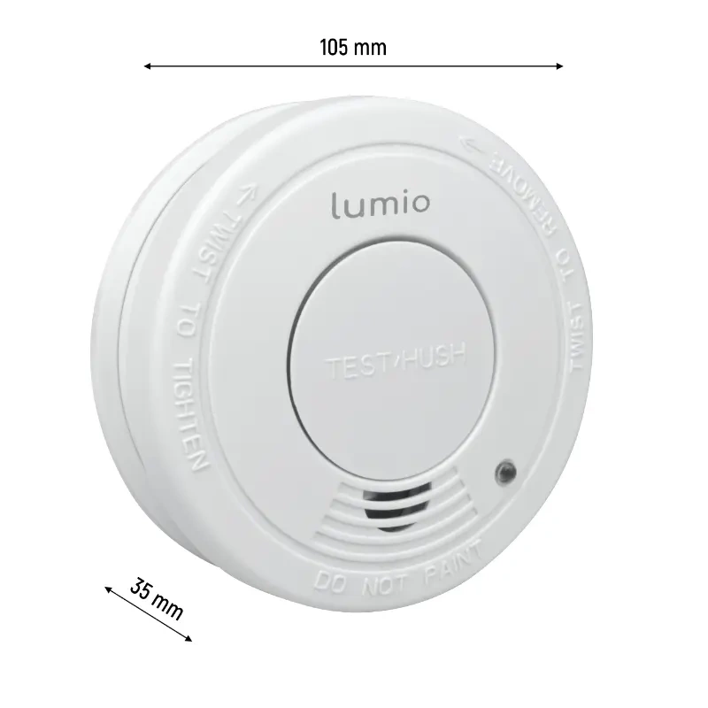 LUMIO DSA002 to certyfikowany czujnik dymu, spełniający normę EN 14604:2005+AC:2008. Urządzenie gwarantuje skuteczną ochronę przeciwpożarową przez cały okres użytkowania, ostrzegając w porę o zagrożeniu. To prosty i skuteczny sposób, by zadbać o bezpieczeństwo rodziny, mieszkania i mienia.
