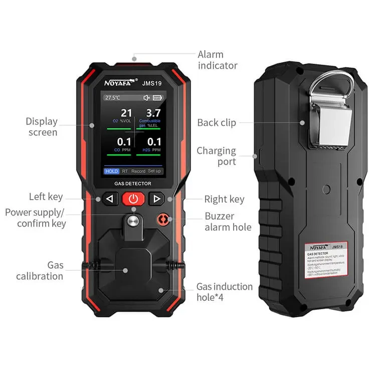 Detektor NOYAFA JMS19 umożliwia wykrywanie tlenu (O₂), tlenku węgla (CO), siarkowodoru (H₂S) oraz gazów palnych takich jak metan, propan, LPG czy gaz ziemny. Dzięki temu jedno kompaktowe urządzenie zastępuje kilka oddzielnych mierników.