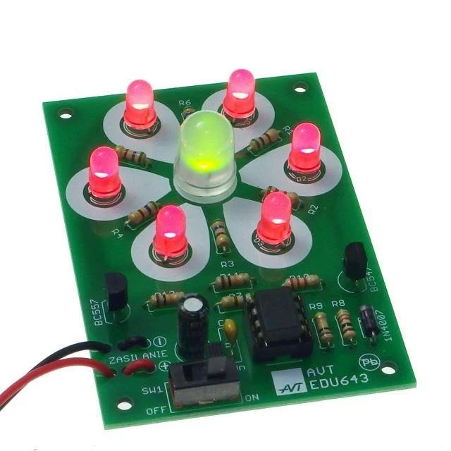 W tym nieskomplikowanym zestawie siedem dwukolorowych diod LED ułożonych jest na tle rysunku kwiatka. Z niewielką częstotliwością przełączane są dwukolorowe czerwono-zielone diody LED. Środkowa dioda LED o średnicy 10mm świeci kolorem przeciwstawnym do pozostałych sześciu o średnicy 5mm. Odwrotnie do pozostałych świecenie diody LED zwiększa dynamikę tworzonej animacji.