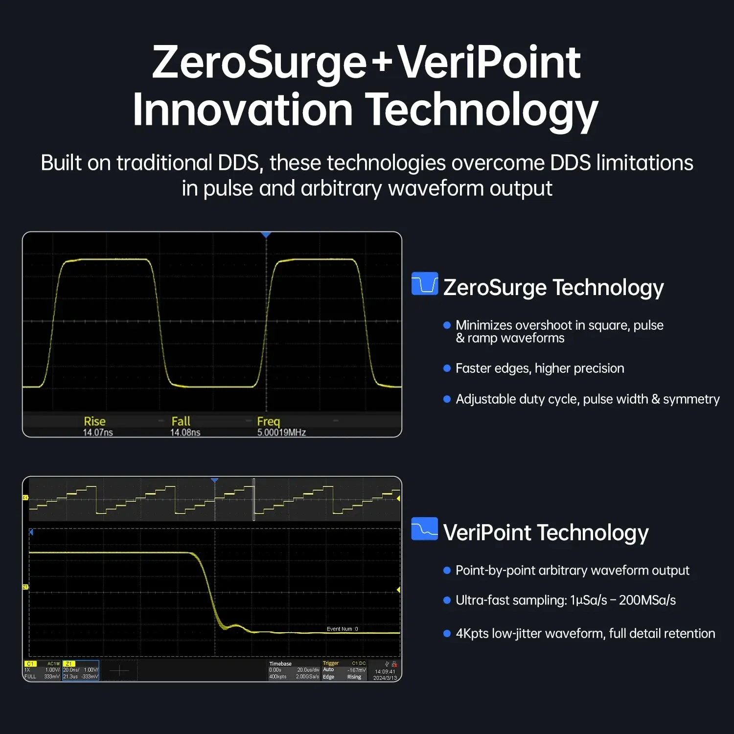 Generator obsługuje przebiegi standardowe (m.in. sinusoida, prostokąt, ramp, impuls, szum, DC) oraz "prawdziwe" arbitralne przebiegi punkt-po-punkcie (True point-by-point), co jest ważne przy odtwarzaniu kształtów, gdzie liczy się każdy detal, a nie tylko aproksymacja. Technologie producenta typu ZeroSurge i VeriPoint wspierają generowanie szybkich sygnałów prostokątnych i impulsowych z niskim przeregulowaniem oraz ostrymi zboczami, co ułatwia testy logiki, bramek i układów czasowych.