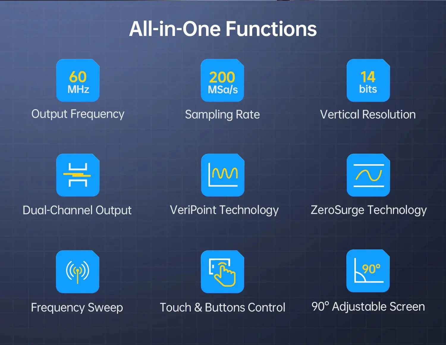 Model TSG6020 pracuje do 60 MHz i oferuje 2 niezależne kanały, próbkowanie do 200 MSa/s oraz rozdzielczość pionową 14 bit, co przekłada się na dobrą szczegółowość kształtu sygnału i precyzyjne nastawy amplitudy, offsetu i fazy. Maksymalna amplituda wyjściowa to do 20 Vpp (zależnie od obciążenia), a urządzenie umożliwia wygodne ustawianie parametrów zarówno dotykiem, jak i fizycznymi przyciskami z enkoderem.