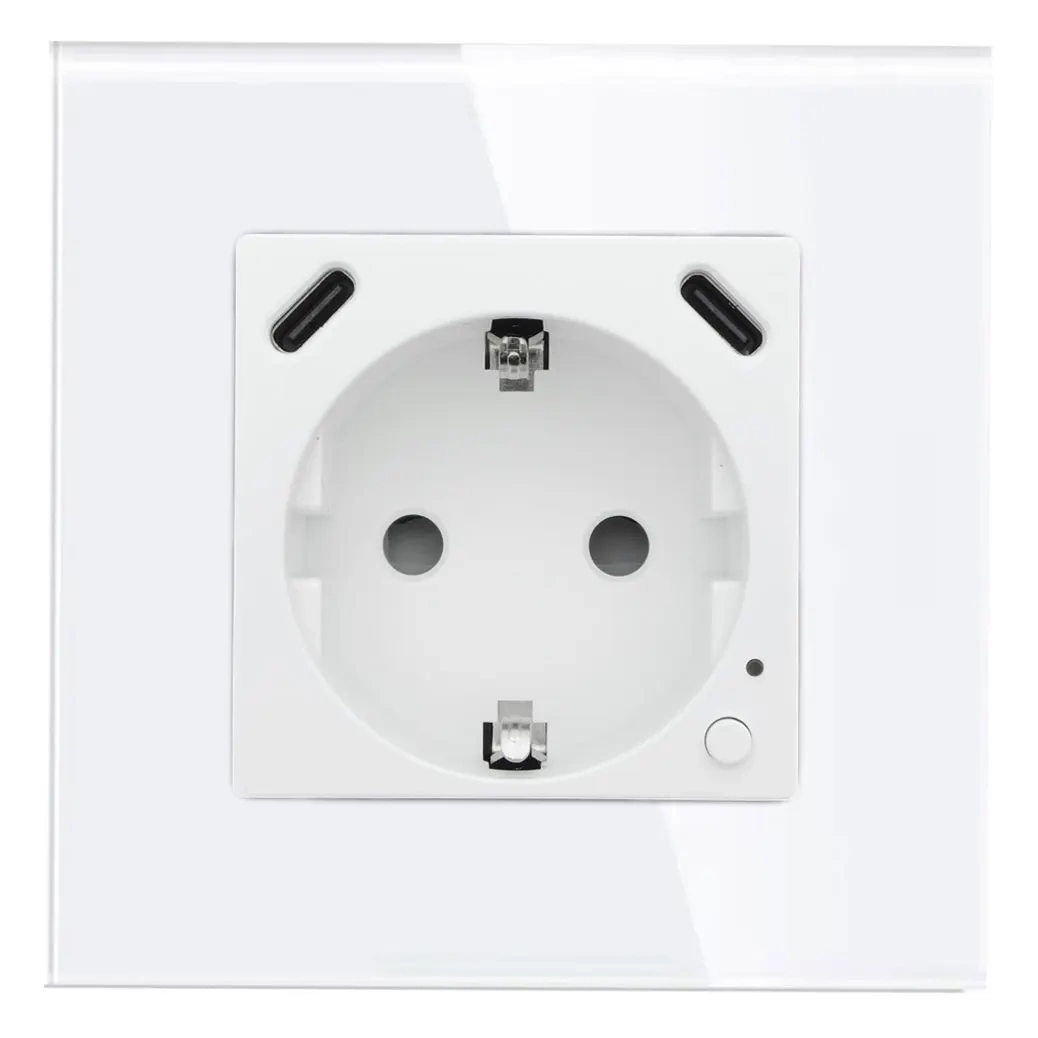Gniazdko pojedyncze Schuko, 2x USB-C 20W - watomierz - ZigBee - szklana ramka - biały - Tawoia Glass