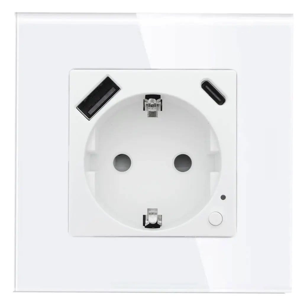 Gniazdko pojedyncze Schuko z USB A+C 20W - watomierz - ZigBee - szklana ramka - biały - Tawoia Glass