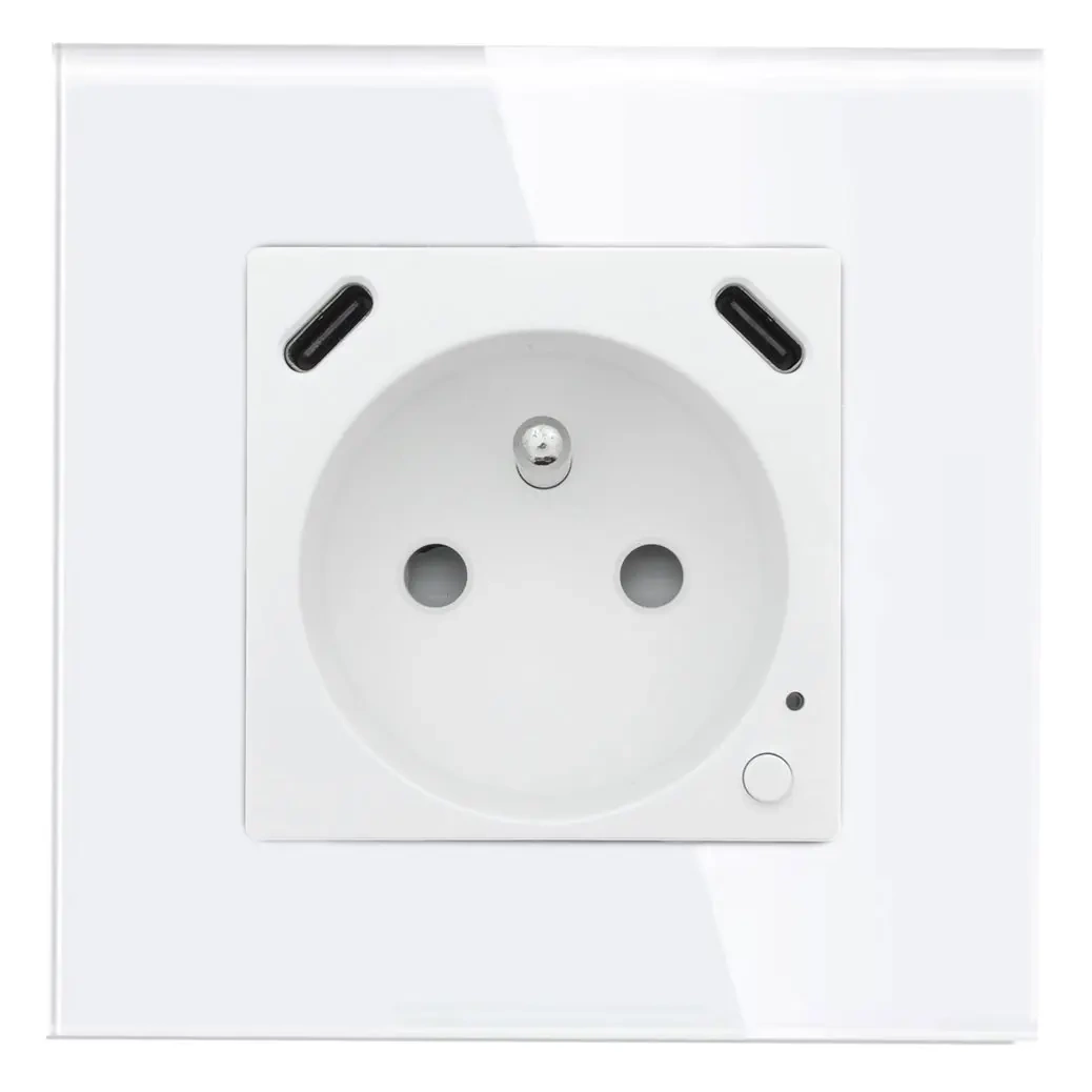 Gniazdko pojedyncze z bolcem, 2x USB-C 20W - watomierz - WiFi / BT - szklana ramka - biały - Tawoia Glass