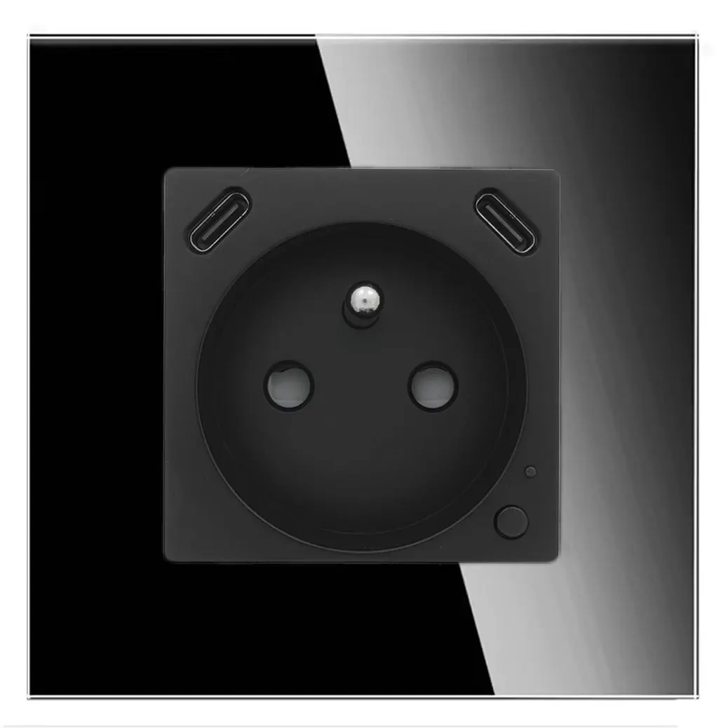Gniazdko pojedyncze z bolcem, 2x USB-C 20W - watomierz - WiFi / BT - szklana ramka - czarny - Tawoia Glass