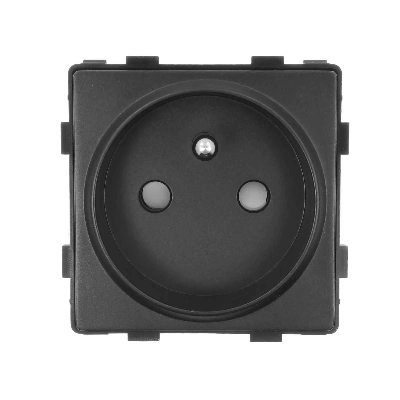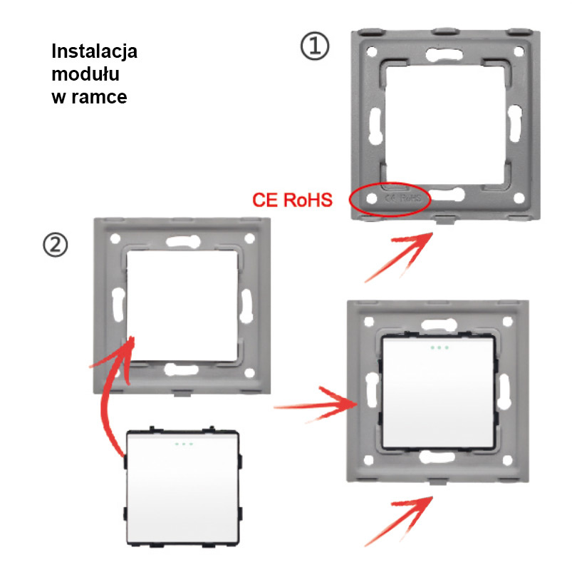 - Montaż modułu – wprowadź moduł gniazda do metalowej ramki, która jest w komplecie z ramką szklaną. Uwaga: oznaczenie "CE RoHS" ma być od strony ściany. Moduł zamontuj z wyczuciem na wcisk. Prawidłowo zamontowany moduł w metalowej ramce tworzy z nią stabilną całość.
