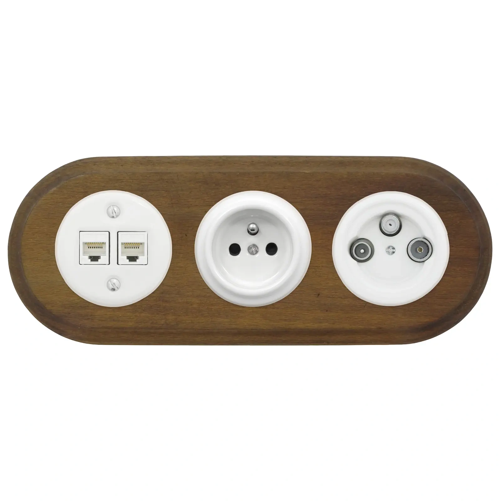 Gniazdo Ethernet Cat6 x2 + Gniazdo elektryczne + Gniazdo TV/SAT białe z ramką potrójną ciemne drewno, montaż podtynkowy, Ceramic Loft
