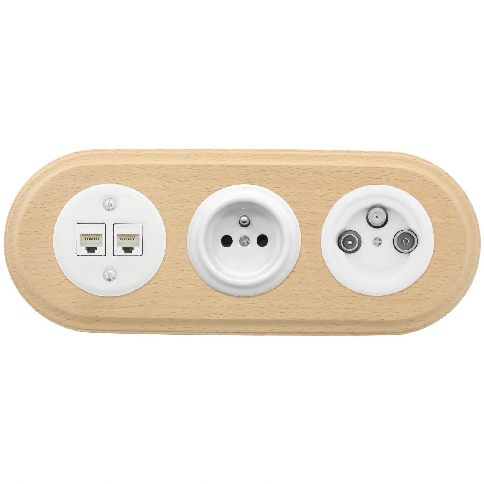 Gniazdo Ethernet Cat6 x2 + Gniazdo elektryczne + Gniazdo TV/SAT białe z ramką potrójną jasne drewno, montaż podtynkowy, Ceramic Loft