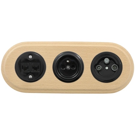 Gniazdo Ethernet Cat6 x2 + Gniazdo elektryczne + Gniazdo TV/SAT czarne z ramką potrójną jasne drewno, montaż podtynkowy, Ceramic Loft
