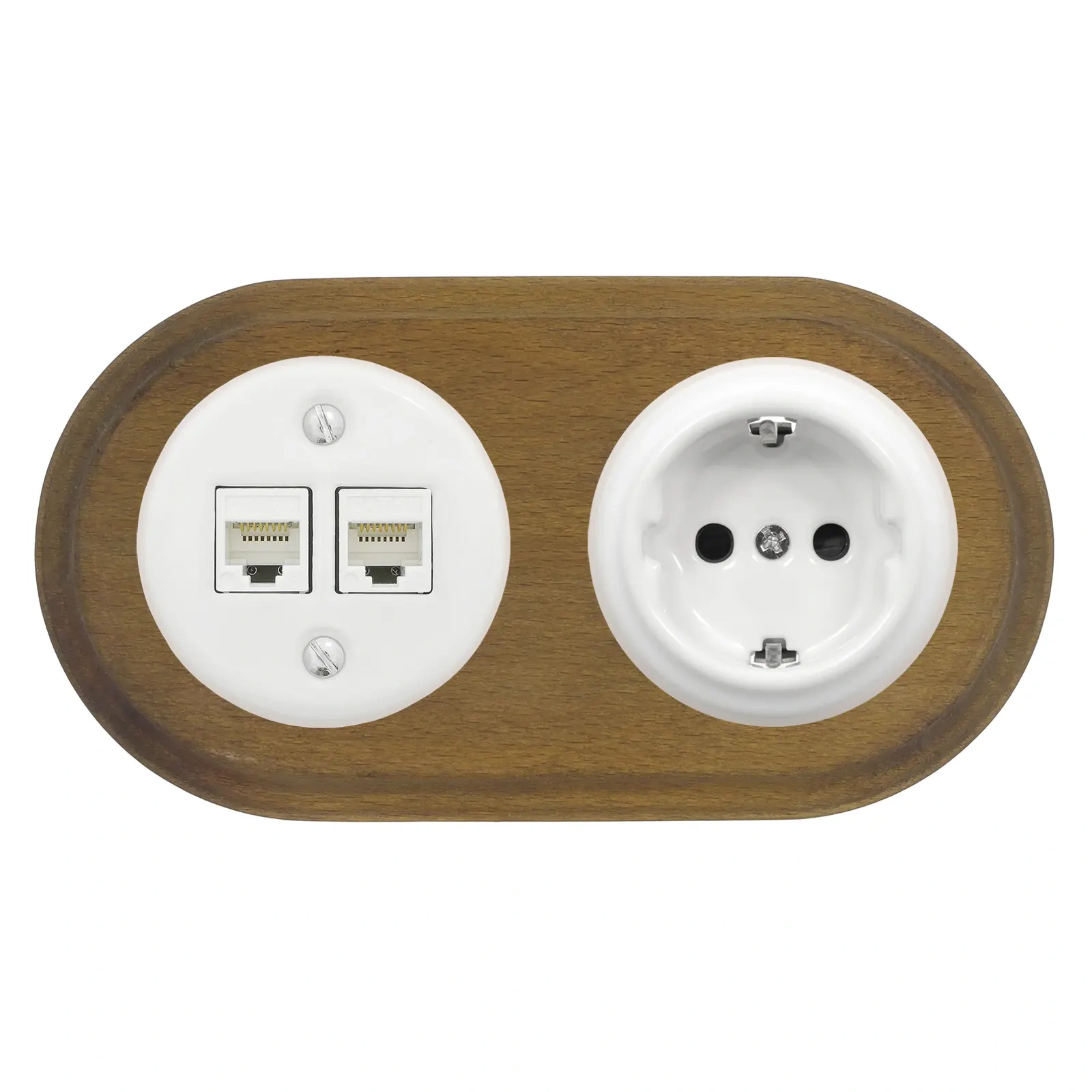 Gniazdo Ethernet Cat6 x2 + Gniazdo elektryczne okrągłe białe z ramką podwójną ciemne drewno, montaż podtynkowy, Ceramic Loft