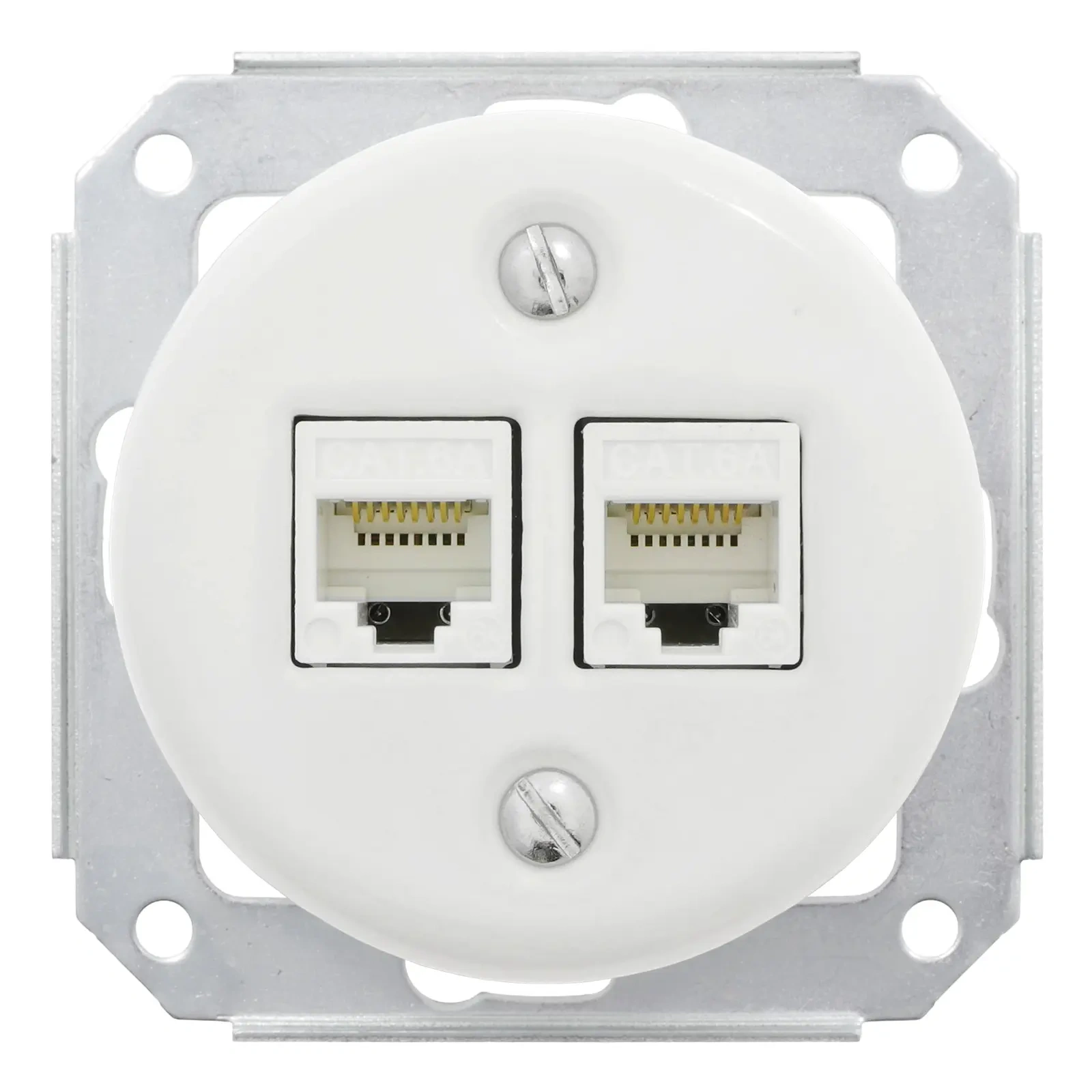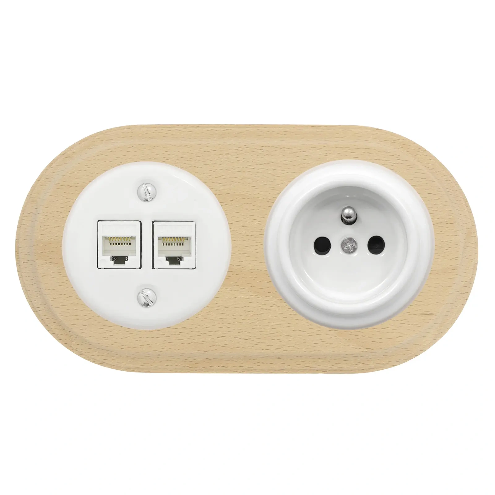 Gniazdo Ethernet Cat6 x2 + Gniazdo elektryczne okrągłe białe z ramką podwójną jasne drewno, montaż podtynkowy, Ceramic Loft