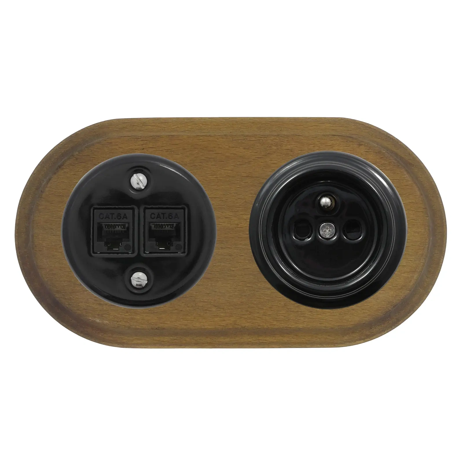 Gniazdo Ethernet Cat6 x2 + Gniazdo elektryczne okrągłe czarne z ramką podwójną ciemne drewno, montaż podtynkowy, Ceramic Loft