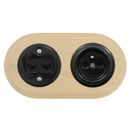 Gniazdo Ethernet Cat6 x2 + Gniazdo elektryczne okrągłe czarne z ramką podwójną jasne drewno, montaż podtynkowy, Ceramic Loft