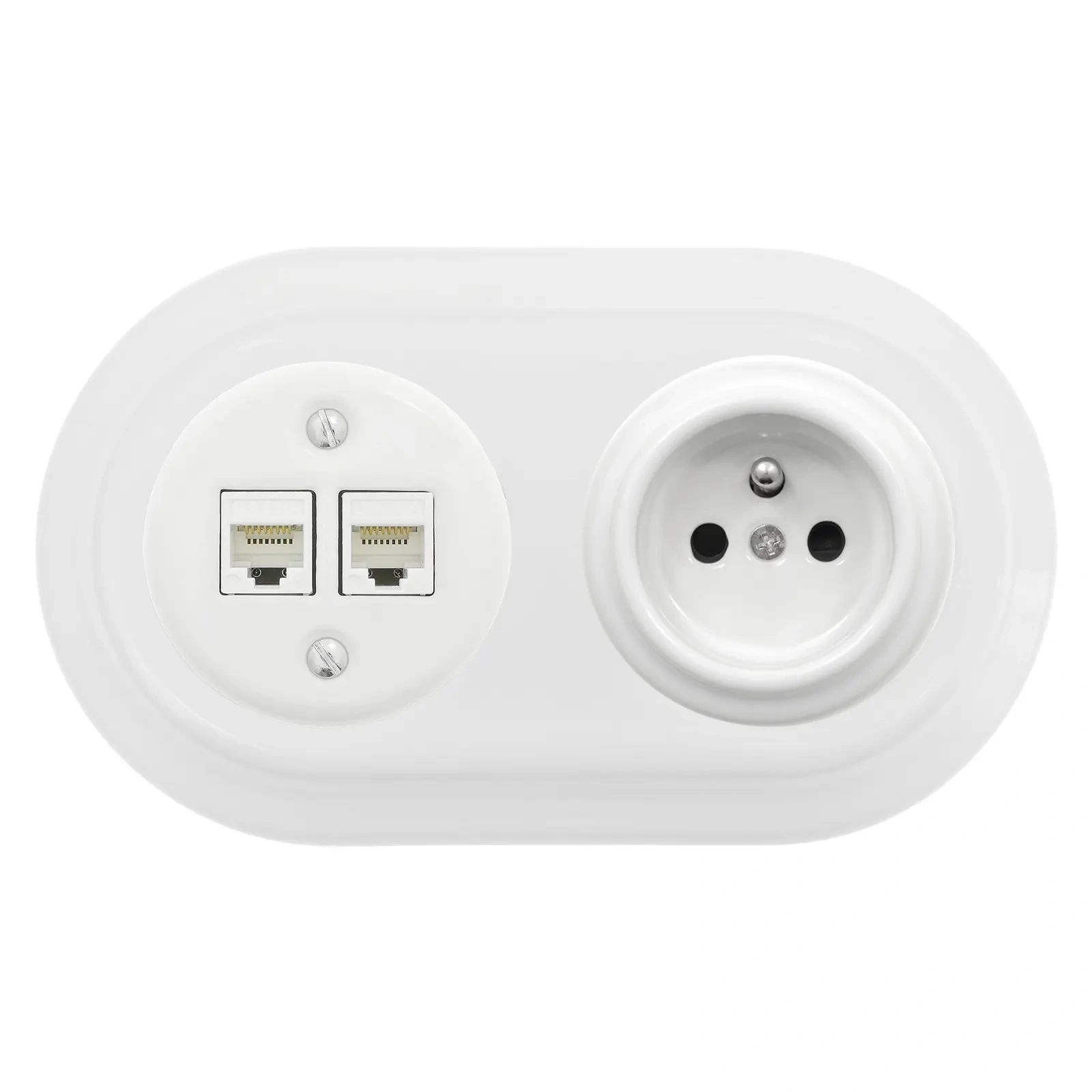 Gniazdo Ethernet Cat6 x2 + Gniazdo elektryczne okrągłe z ramką podwójną, białe, montaż podtynkowy, Ceramic Loft