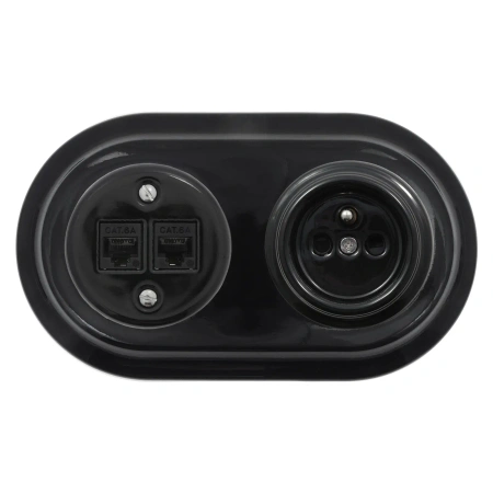 Gniazdo Ethernet Cat6 x2 + Gniazdo elektryczne okrągłe z ramką podwójną, czarne, montaż podtynkowy, Ceramic Loft