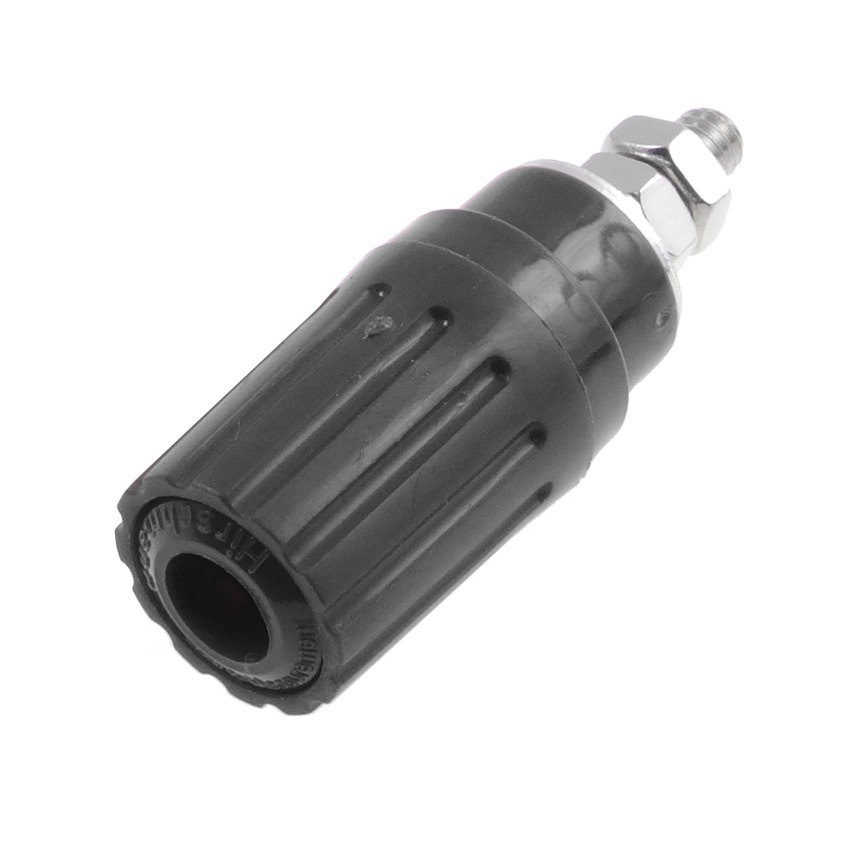 Izolowane gniazdo bananowe laboratoryjne Ø4mm z poprzecznym otworem Ø2mm oraz izolacyjnymi pierścieniami przepustowymi. Główka gniazda jest przykręcana oraz odciągana do szybkiego przyłączenia przewodu.