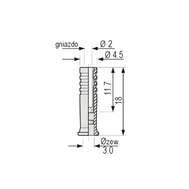Izolowane gniazdko Ø2mm w osłonie z miękkiego tworzywa do montażu na przewodach. Odpowiednie do wykonania przedłużacza typu 'wtyk - gniazdko' lub 'gniazdko - gniazdko'. Przyłącze lutowane dla przewodów do 0,75 mm² (otwór Ø1,4mm). Część metalowa z mosiądzu cynowanego.