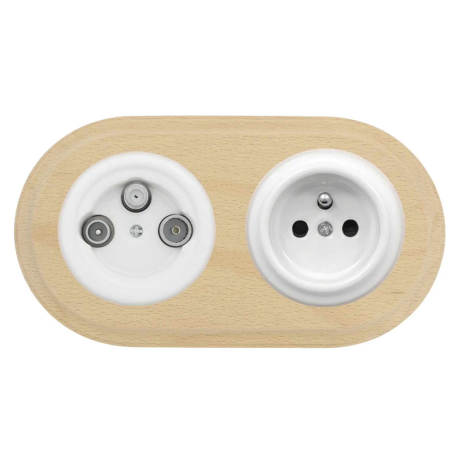 Gniazdo TV/SAT + Gniazdo elektryczne okrągłe białe z ramką podwójną jasne drewno, montaż podtynkowy, Ceramic Loft