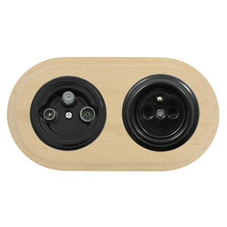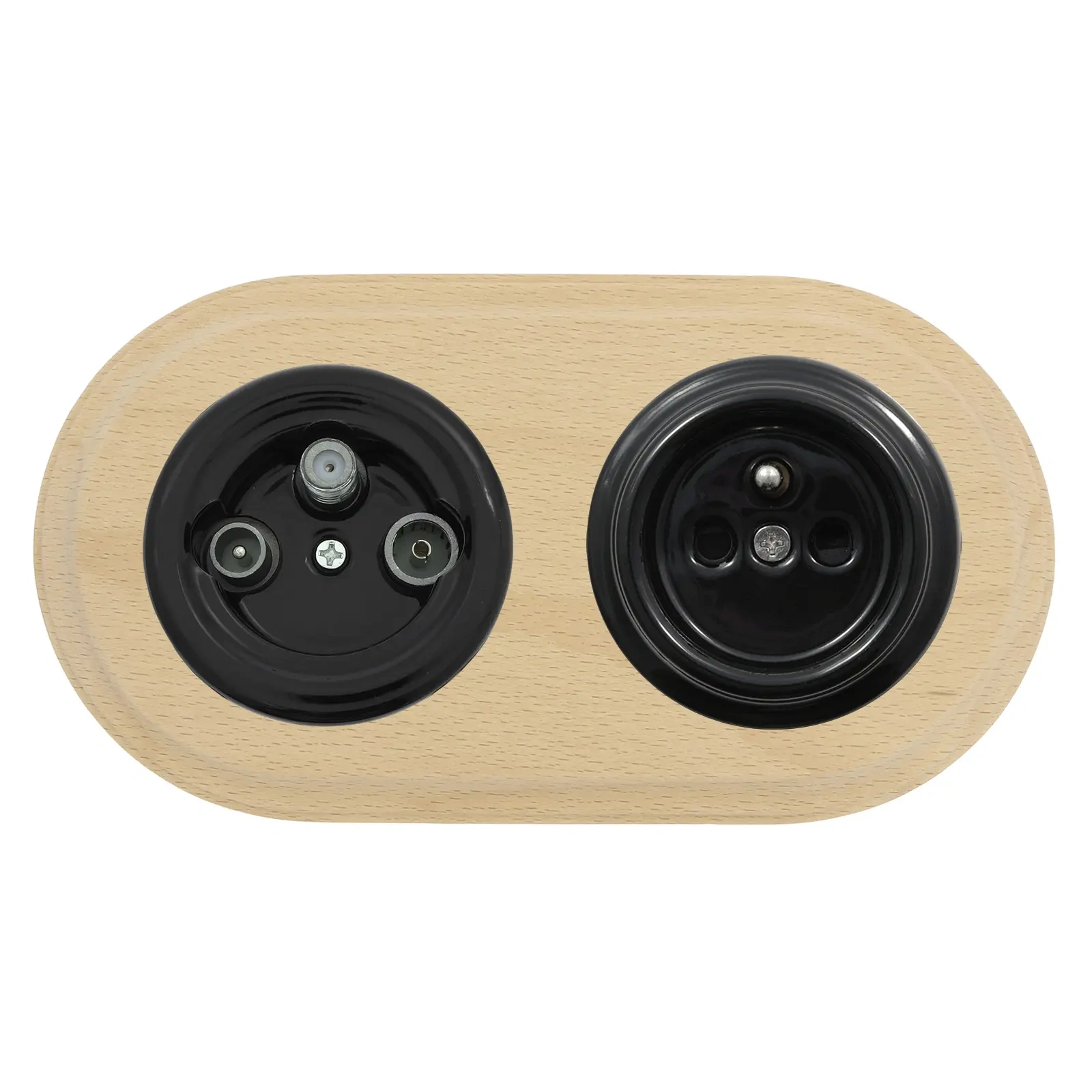 Gniazdo TV/SAT + Gniazdo elektryczne okrągłe czarne z ramką podwójną jasne drewno, montaż podtynkowy, Ceramic Loft
