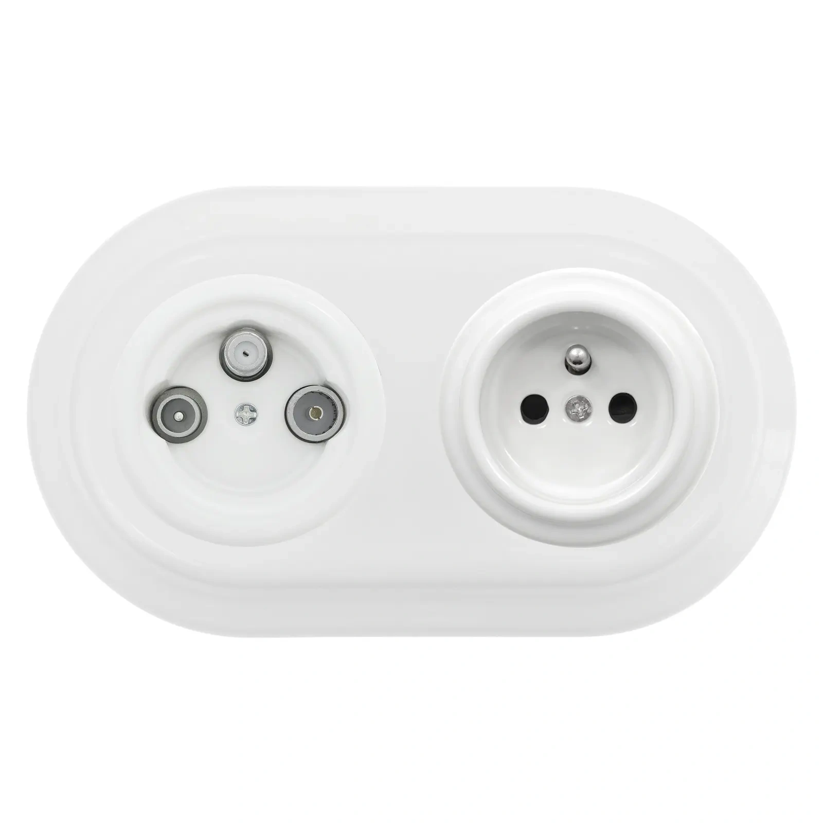 Gniazdo TV/SAT + Gniazdo elektryczne okrągłe z ramką podwójną, białe, montaż podtynkowy, Ceramic Loft