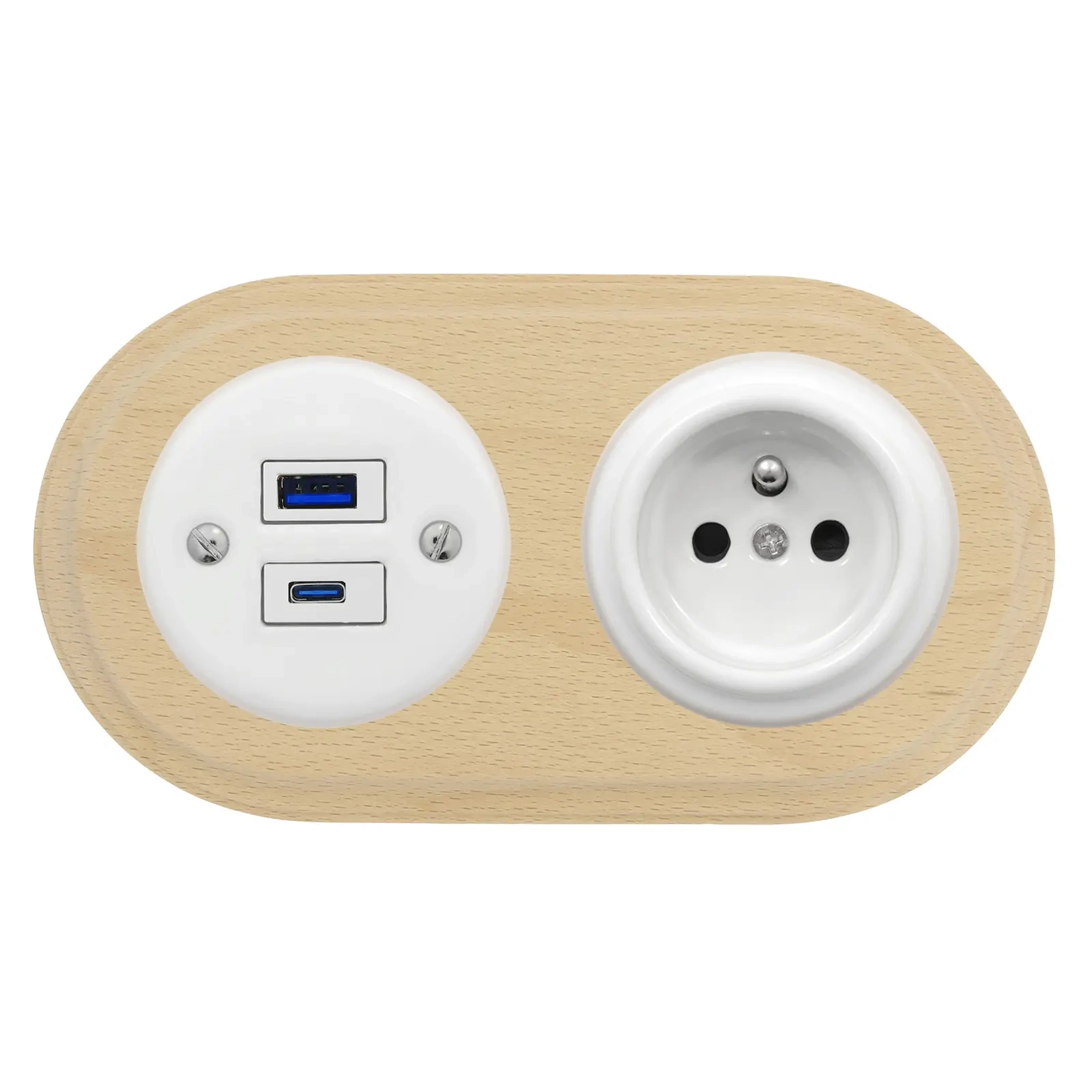 Gniazdo USB A+C 4A + Gniazdo elektryczne okrągłe białe z ramką podwójną jasne drewno, montaż podtynkowy, Ceramic Loft