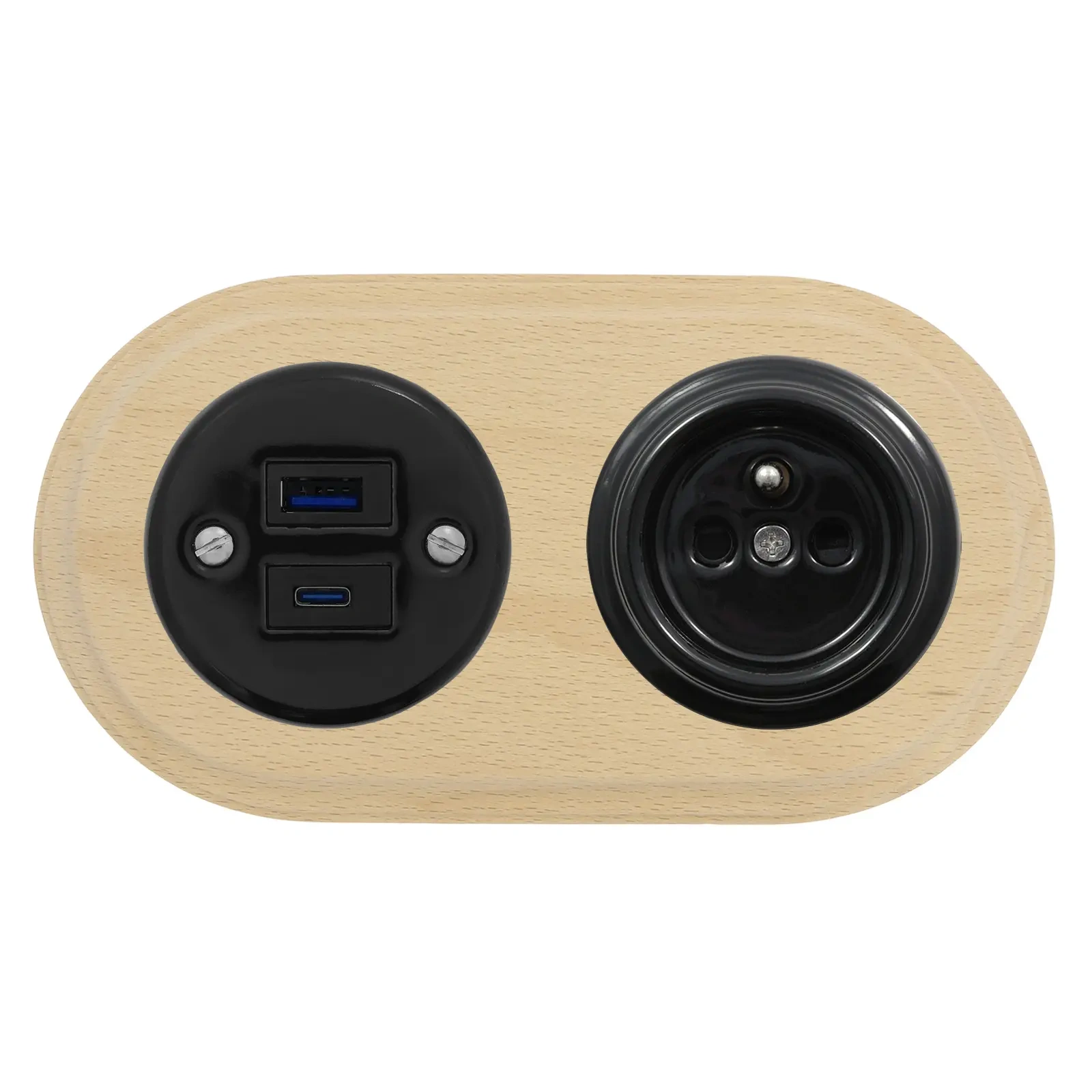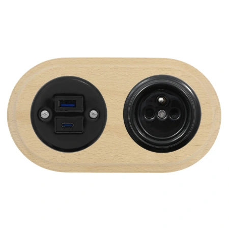 Gniazdo USB A+C 4A + Gniazdo elektryczne okrągłe czarne z ramką podwójną jasne drewno, montaż podtynkowy, Ceramic Loft