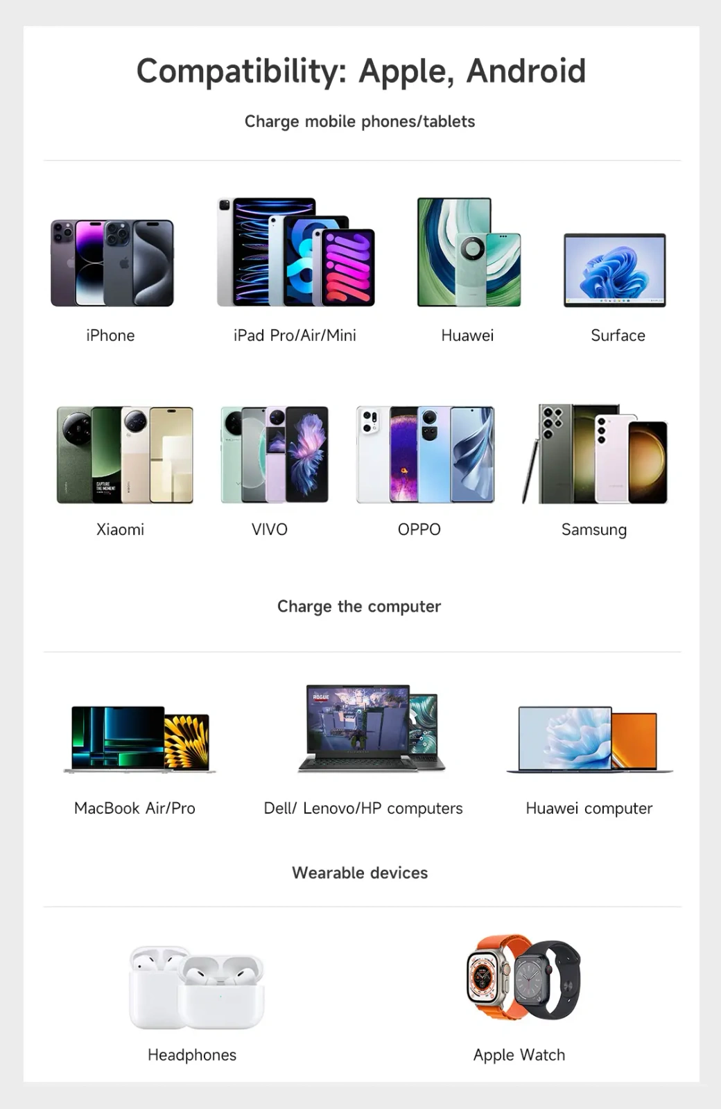 - Przy jednoczesnym ładowaniu wielu urządzeń system sam optymalizuje priorytety mocy.