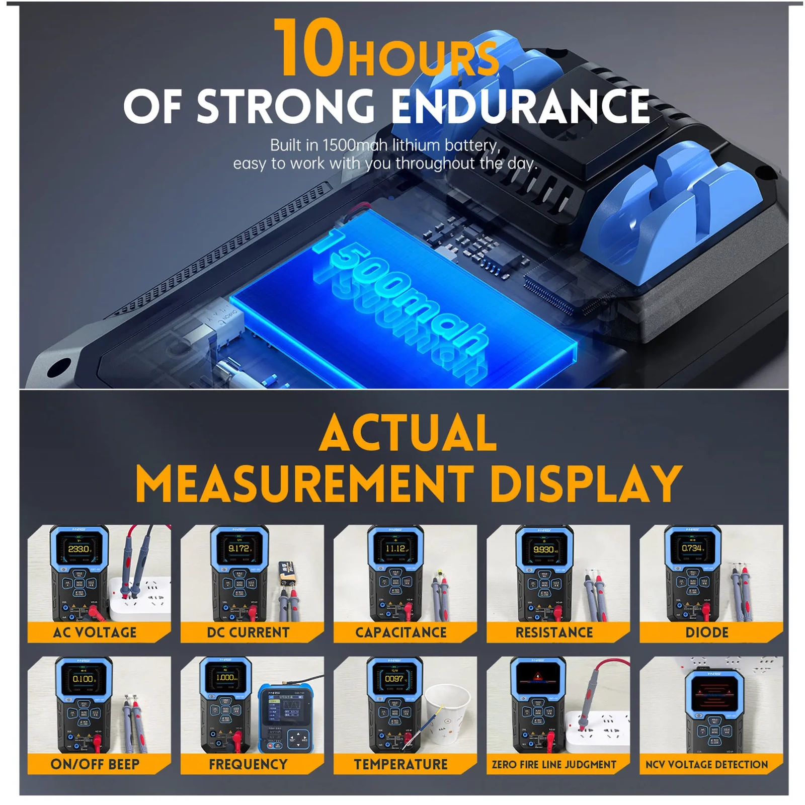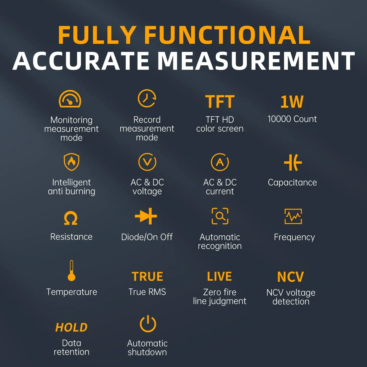 - Szeroki zakres pomiarów: Mierzy napięcie AC/DC, prąd AC/DC, rezystancję, pojemność, częstotliwość, cykl pracy, temperaturę, NCV, przewód pod napięciem i wiele innych parametrów.