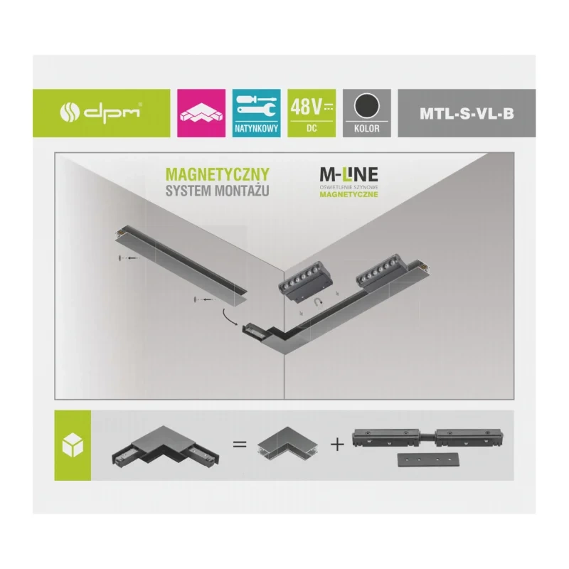 MTL-S-VL wykonany jest z wysokiej jakości tworzywa oraz metalowych styków przewodzących, gwarantujących niezawodny kontakt elektryczny i trwałość połączenia. Montaż odbywa się poprzez wsunięcie końców łącznika w profile szyn magnetycznych - szybko, bez użycia narzędzi. Konstrukcja jest w pełni dopasowana do szyn M-LINE, co zapewnia idealne spasowanie i ciągłość napięcia.