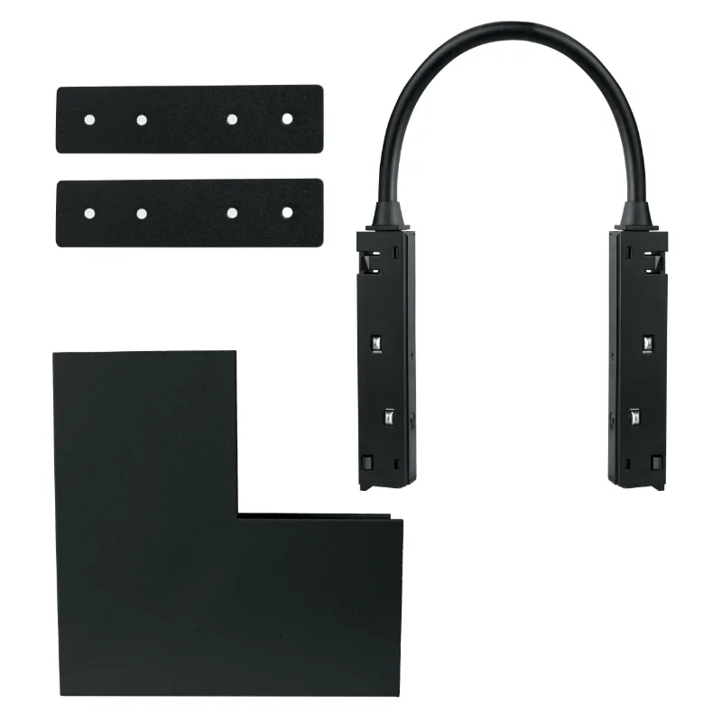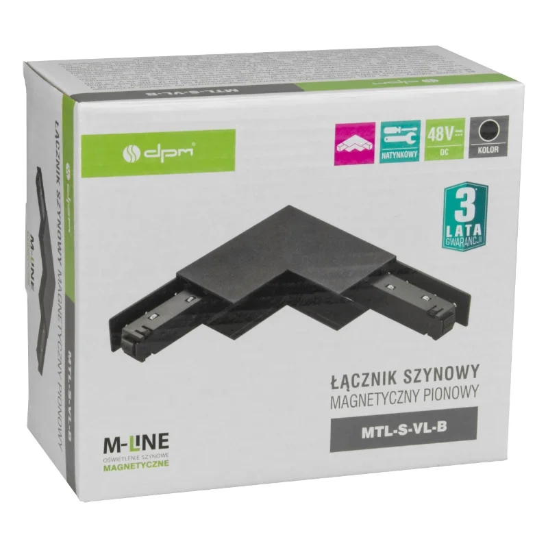 Łącznik kątowy pionowy M-LINE MTL-S-VL to precyzyjny element systemu oświetleniowego M-LINE, umożliwiający połączenie dwóch odcinków szyn magnetycznych pod kątem 90° w płaszczyźnie pionowej. Umożliwia estetyczne i bezpieczne prowadzenie instalacji oświetleniowej z jednej płaszczyzny (np. sufitu) na drugą (np. ścianę), zachowując ciągłość zasilania i spójność wizualną całego systemu.