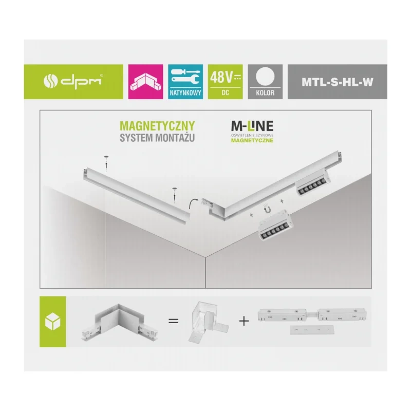 Łącznik MTL-S-HL został zaprojektowany do łączenia dwóch odcinków szyn magnetycznych M-LINE pod kątem 90°, w jednej płaszczyźnie. Dzięki niemu możliwe jest tworzenie rozbudowanych konfiguracji oświetlenia - np. kształtów typu L, U lub prostokątnych ciągów świetlnych. Element zapewnia stabilne połączenie mechaniczne i elektryczne, umożliwiając swobodny przepływ napięcia DC 48 V w całym systemie.