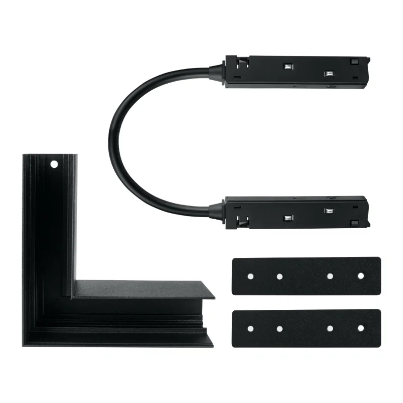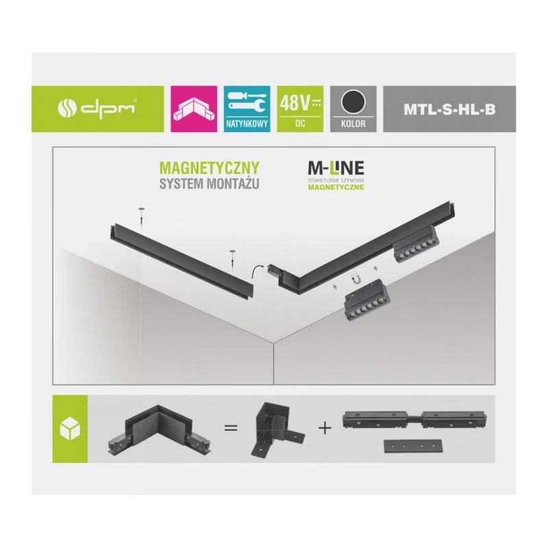 Łącznik MTL-S-HL został zaprojektowany do łączenia dwóch odcinków szyn magnetycznych M-LINE pod kątem 90°, w jednej płaszczyźnie. Dzięki niemu możliwe jest tworzenie rozbudowanych konfiguracji oświetlenia - np. kształtów typu L, U lub prostokątnych ciągów świetlnych. Element zapewnia stabilne połączenie mechaniczne i elektryczne, umożliwiając swobodny przepływ napięcia DC 48 V w całym systemie.
