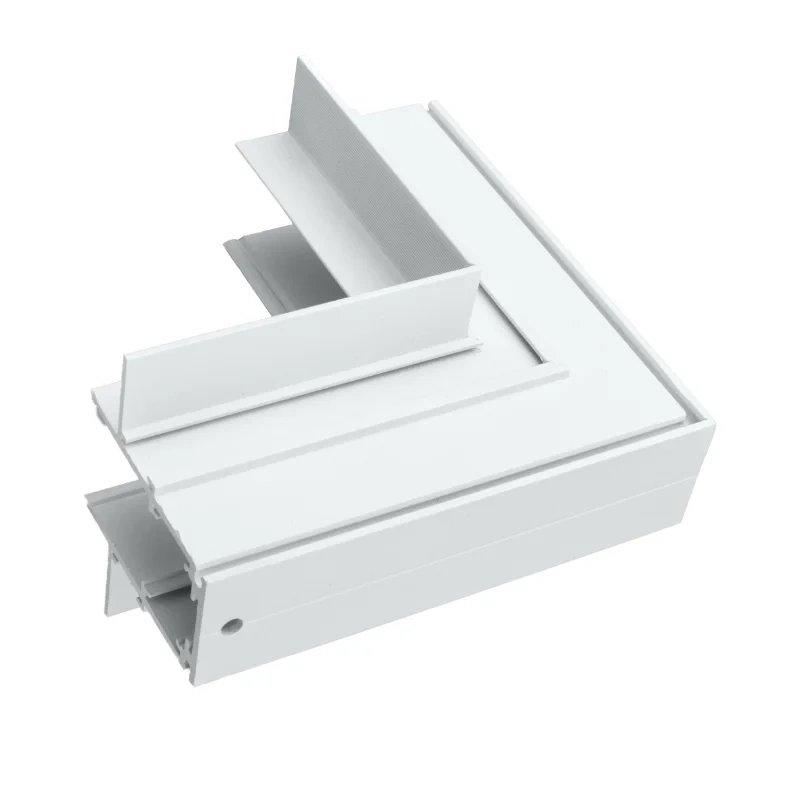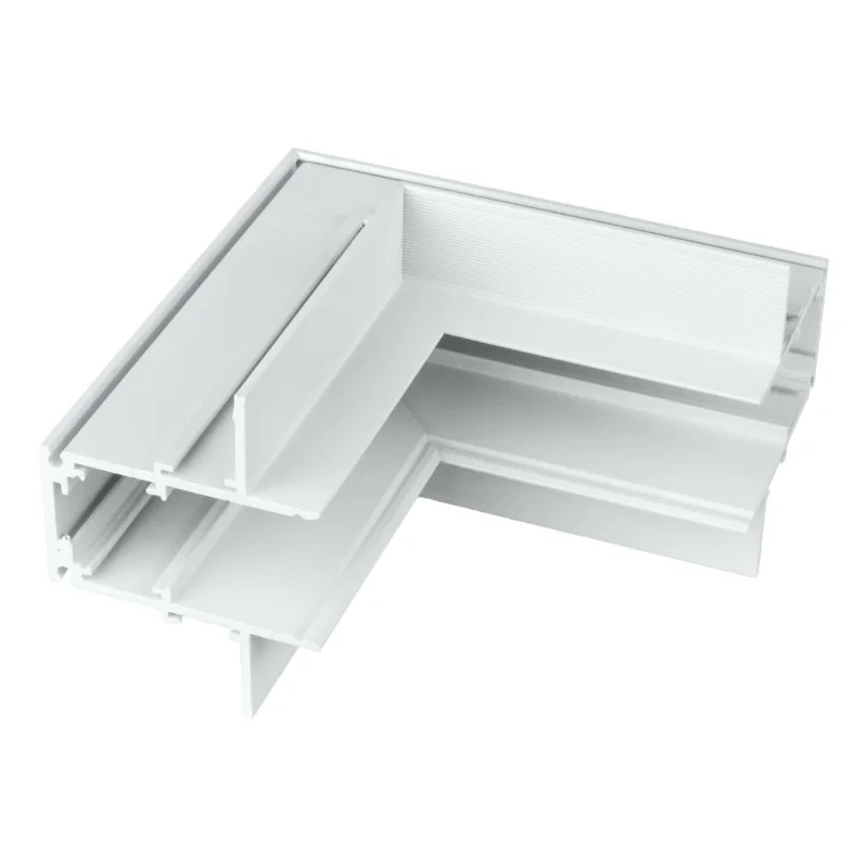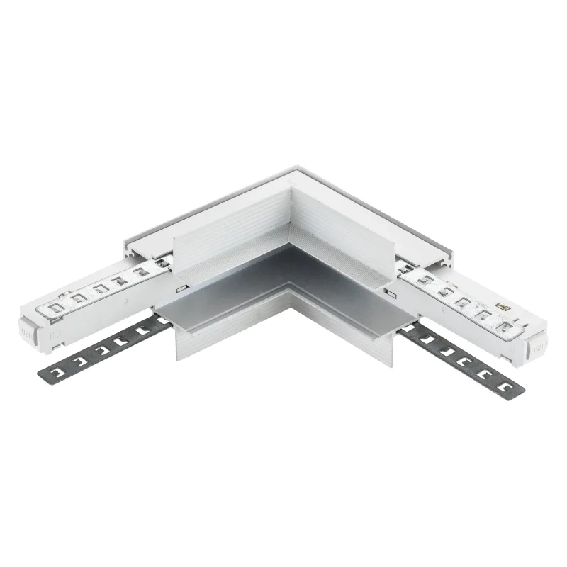 Łącznik MTL-R-IL umożliwia wykonanie wewnętrznego połączenia szyn w narożnikach, zachowując ciągłość zasilania DC 48 V w systemie 1-fazowym. Ułatwia prowadzenie instalacji w zabudowie sufitowej, zapewniając estetyczne połączenie profili bez widocznych łączeń. Dzięki temu możliwe jest tworzenie zintegrowanych, nowoczesnych linii świetlnych w kształcie litery „L”, idealnie dopasowanych do architektury pomieszczenia.