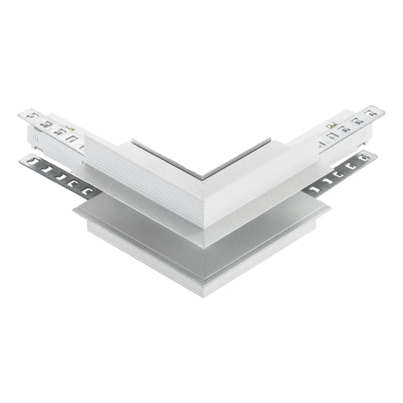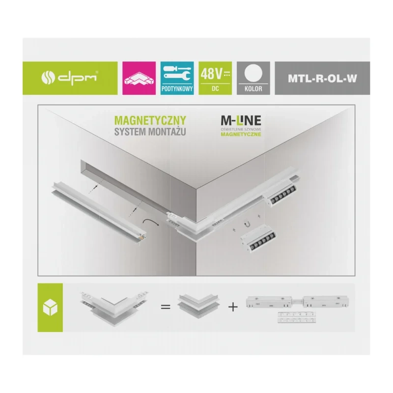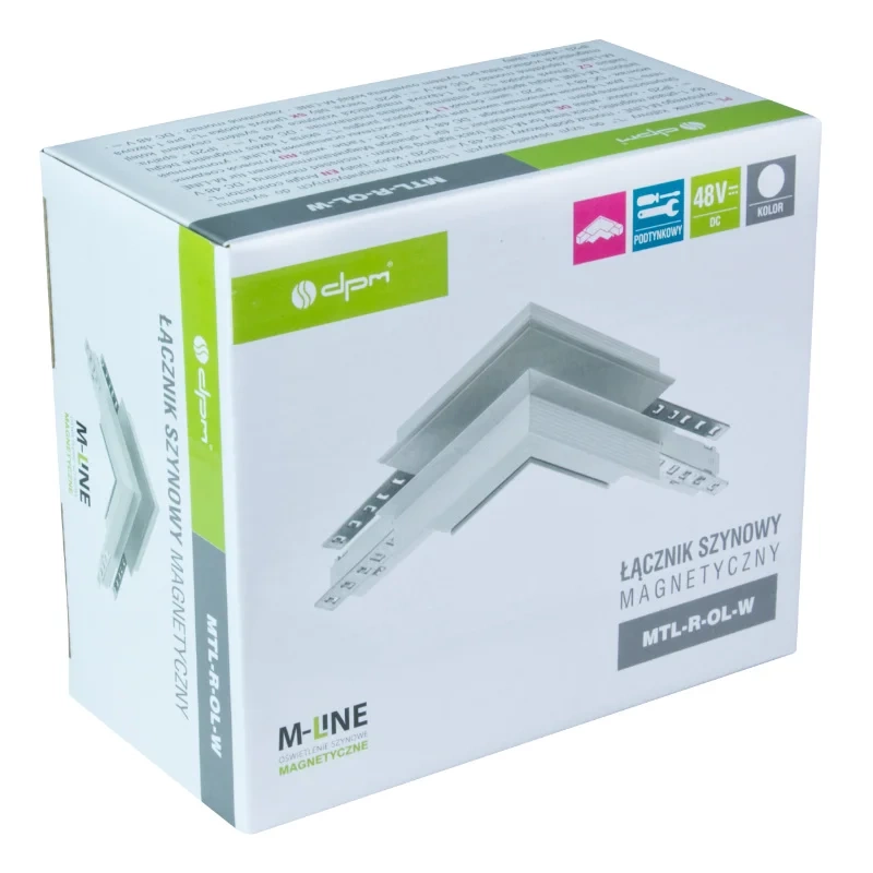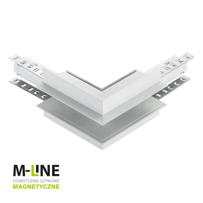 Łącznik szynowy 1-fazowy M-LINE MTL-R-OL to wysokiej jakości element systemu oświetleniowego M-LINE, przeznaczony do łączenia dwóch szyn magnetycznych pod kątem prostym na zewnątrz narożnika. Konstrukcja typu „L” umożliwia tworzenie układów oświetleniowych wychodzących poza granice wnęk i ścian, zachowując pełną ciągłość zasilania DC 48 V w systemie 1-fazowym. Eleganckie, białe wykończenie doskonale komponuje się z nowoczesnymi wnętrzami i pozostałymi elementami serii M-LINE.