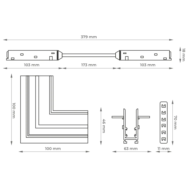 - Umożliwia połączenie szyn magnetycznych pod kątem 90° na zewnętrznych narożnikach.