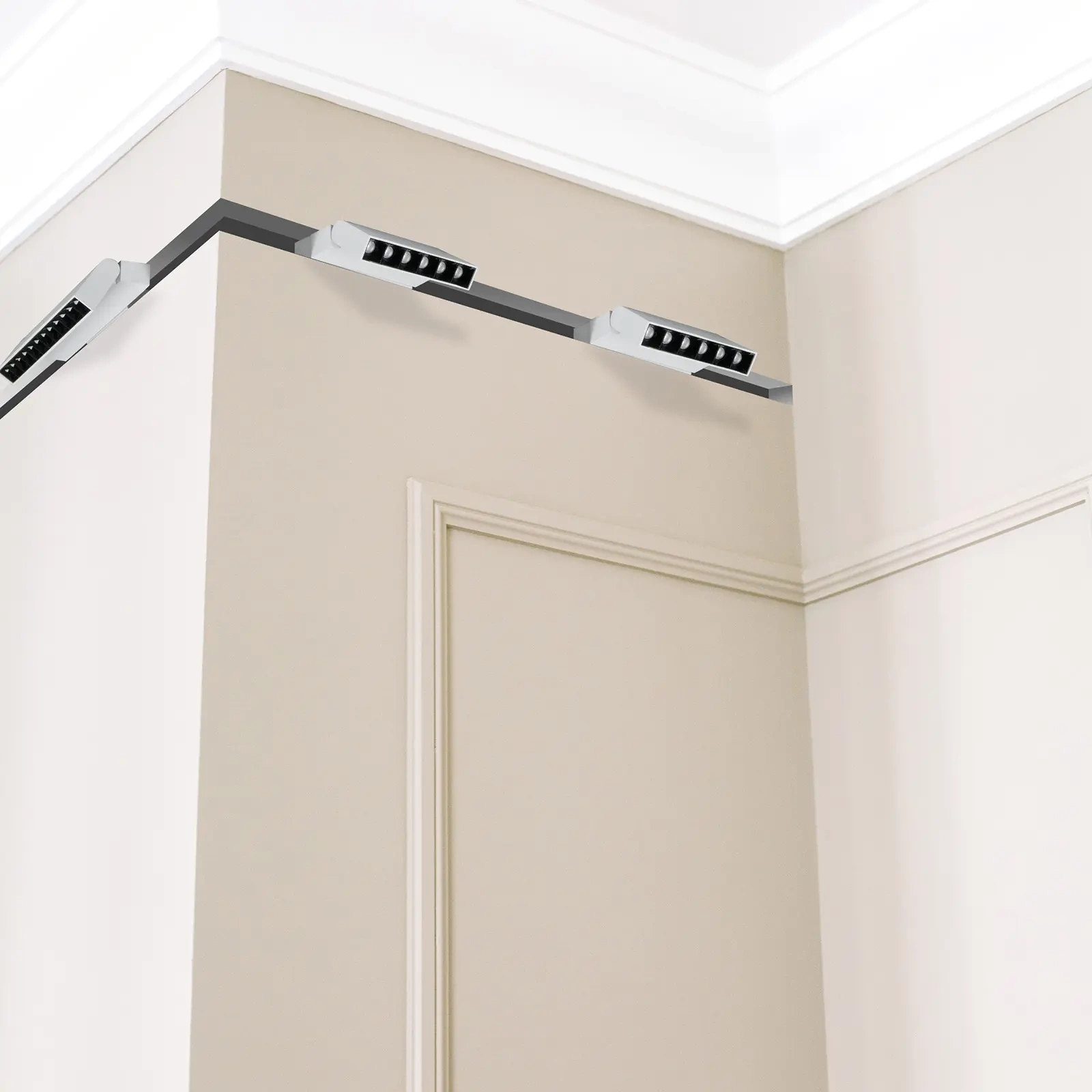 - Możliwość łączenia szyn w rozmaite układy - proste, kątowe (L), sufitowe/ścienne, zewnętrzne czy wewnętrzne