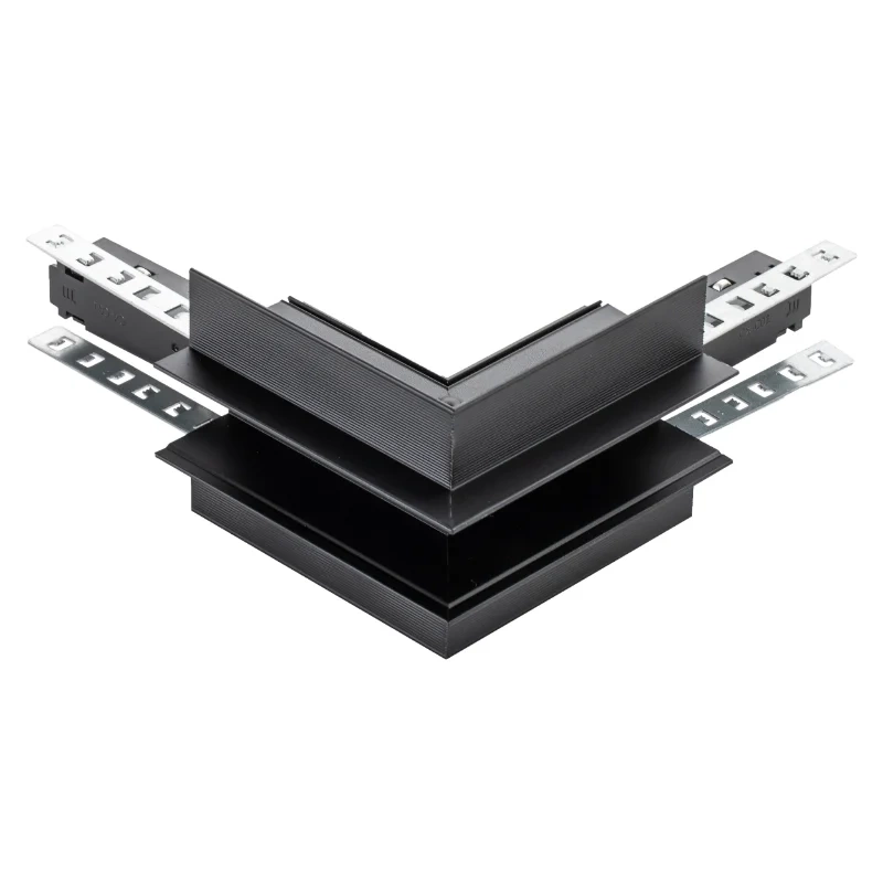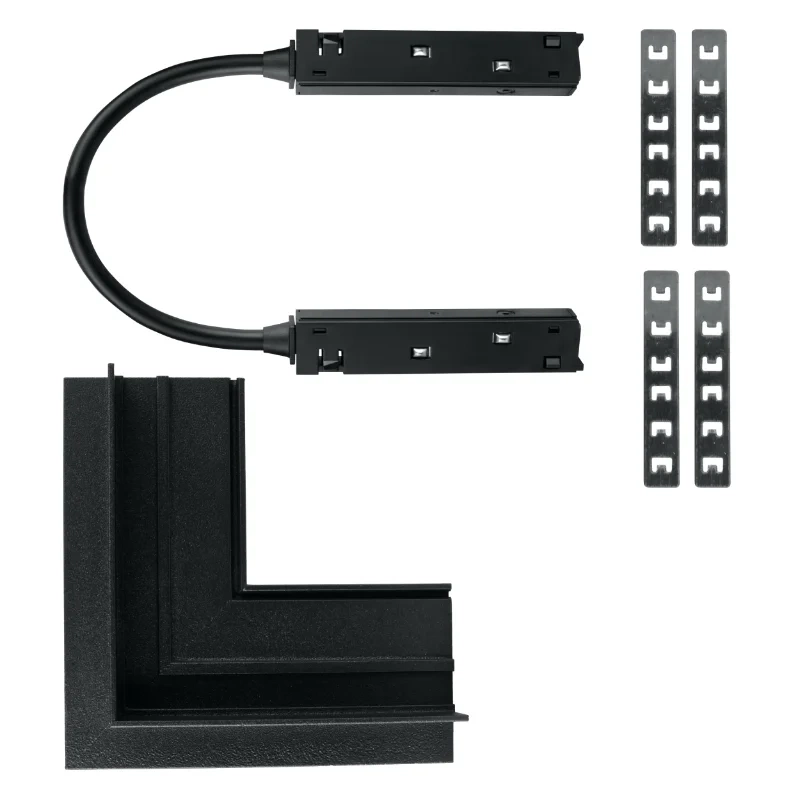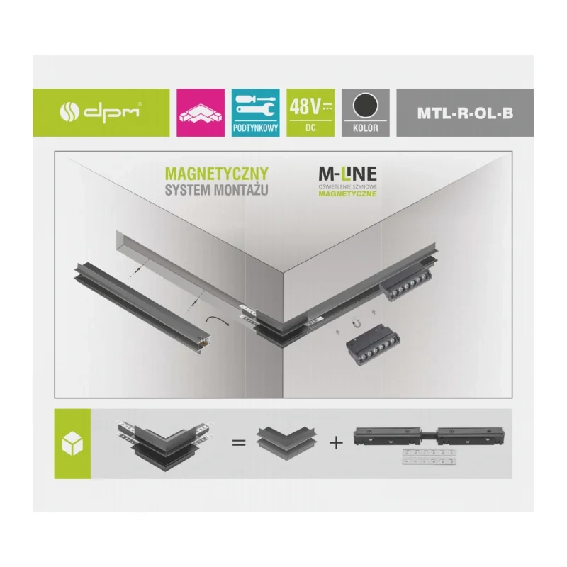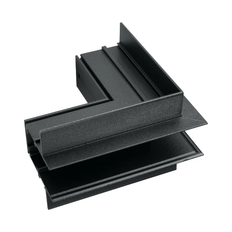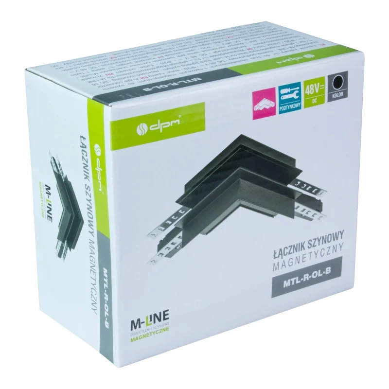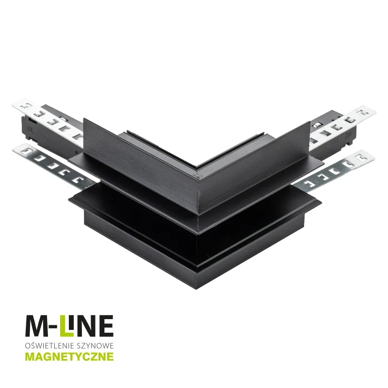 Łącznik szynowy 1-fazowy M-LINE MTL-R-OL to wysokiej jakości element systemu oświetleniowego M-LINE, przeznaczony do łączenia dwóch szyn magnetycznych pod kątem prostym na zewnątrz narożnika. Konstrukcja typu „L” umożliwia tworzenie układów oświetleniowych wychodzących poza granice wnęk i ścian, zachowując pełną ciągłość zasilania DC 48 V w systemie 1-fazowym. Eleganckie, czarne wykończenie doskonale komponuje się z nowoczesnymi wnętrzami i pozostałymi elementami serii M-LINE.
