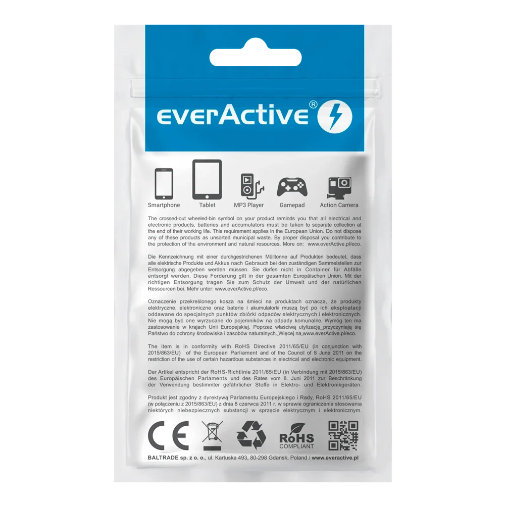 Ładowarki everActive to produkty w pełni certyfikowane i przebadane zgodnie z obowiązującymi normami europejskimi - CE (EMC+LVD+ROHS2).