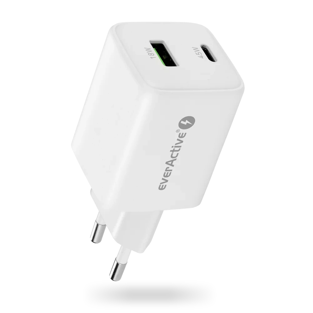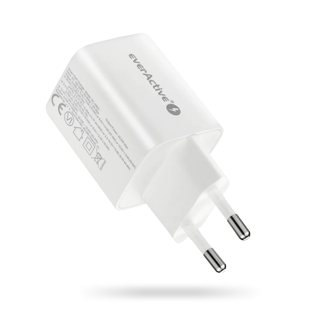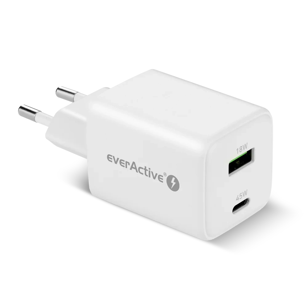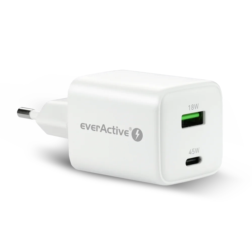 Ładowarka sieciowa everActive GaN SC-450Q z gniazdem USB oraz USB-C PD PPS QC4+ 45W
