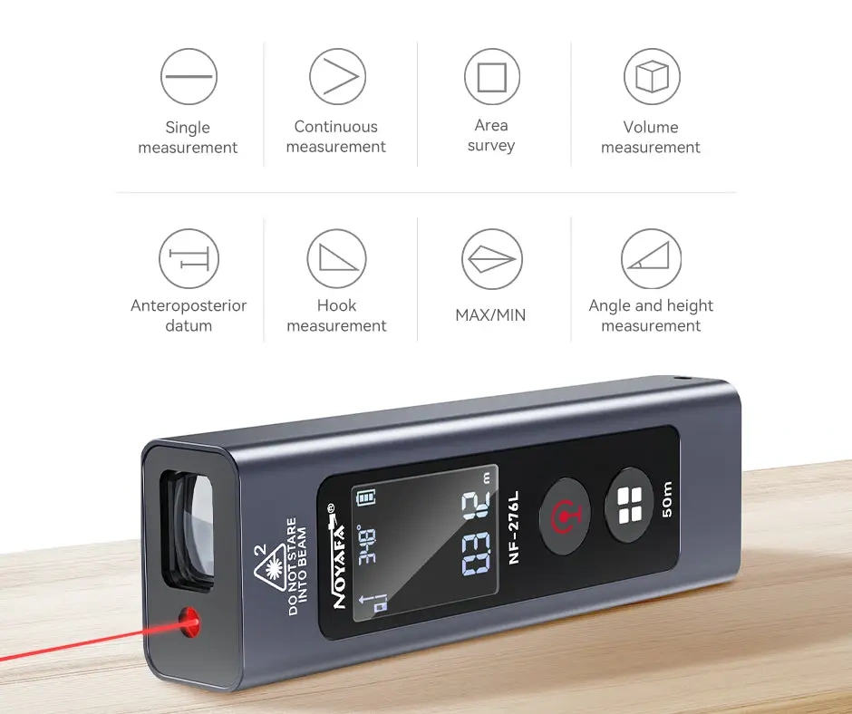 NOYAFA NF-276L to kompaktowy dalmierz laserowy nowej generacji, który służy do precyzyjnych pomiarów odległości, powierzchni, objętości, kątów i wysokości w codziennej pracy technicznej, budowlanej i instalacyjnej. Urządzenie łączy dokładność ±1,5 mm, zasięg do 50 metrów oraz 11 trybów pomiarowych w obudowie mniejszej niż smartfon.