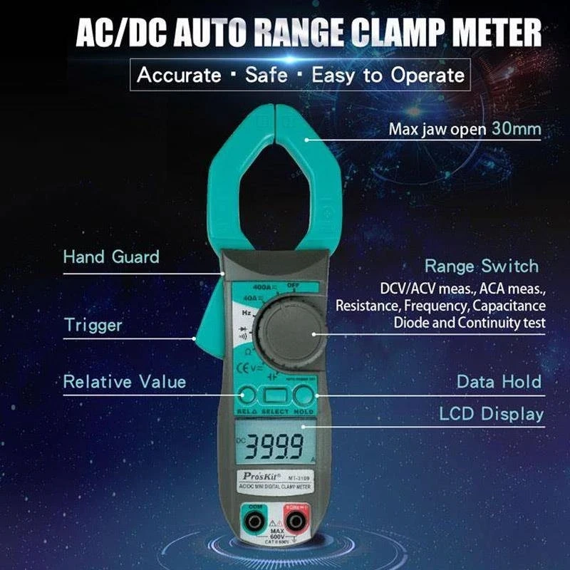 - prąd AC [A]: 40A ±(3.0%+8d), 400A ±(3.0%+5d)