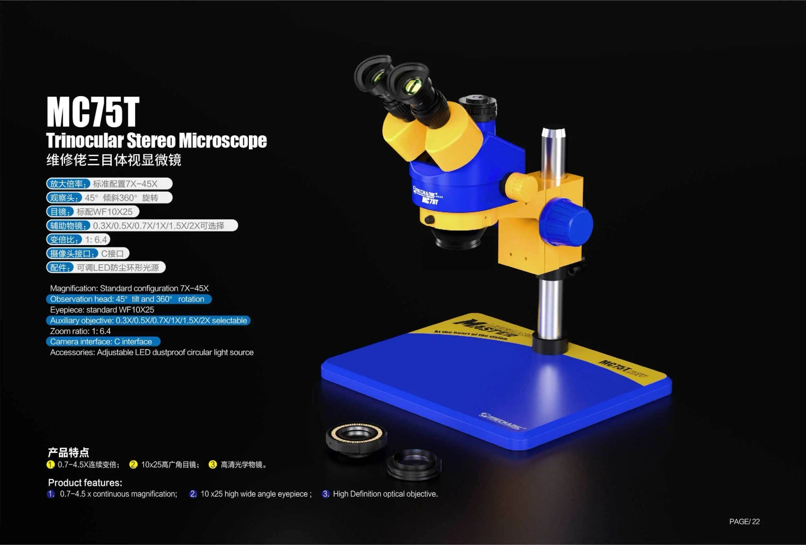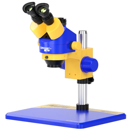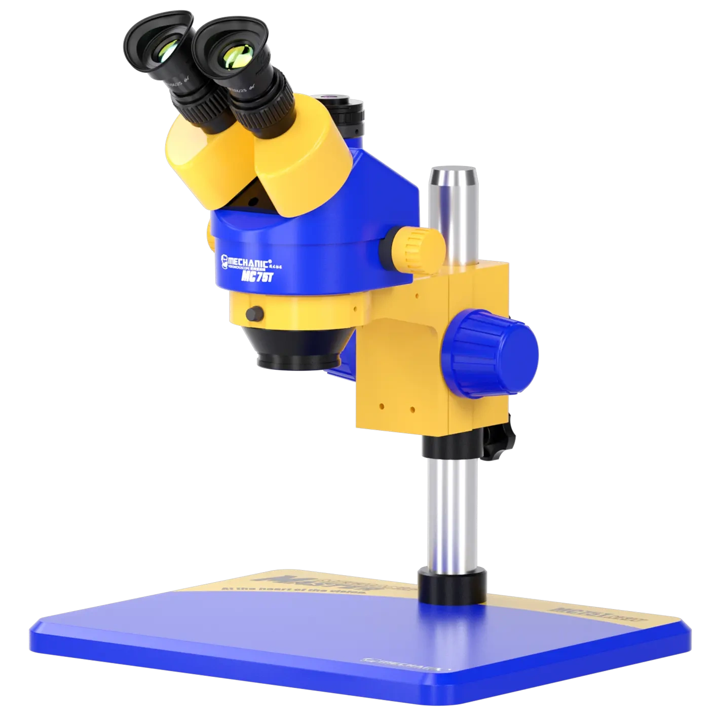 Mechanic MC75T-B11 to trzy-okularowy mikroskop stereoskopowy przeznaczony do precyzyjnej obserwacji przestrzennej elementów elektronicznych i mechanicznych. Konstrukcja trinokularna umożliwia jednoczesną pracę z obrazem w okularach oraz podłączenie kamery przez standardowy interfejs C (C-mount), co pozwala na rejestrację obrazu lub jego podgląd na zewnętrznym ekranie.